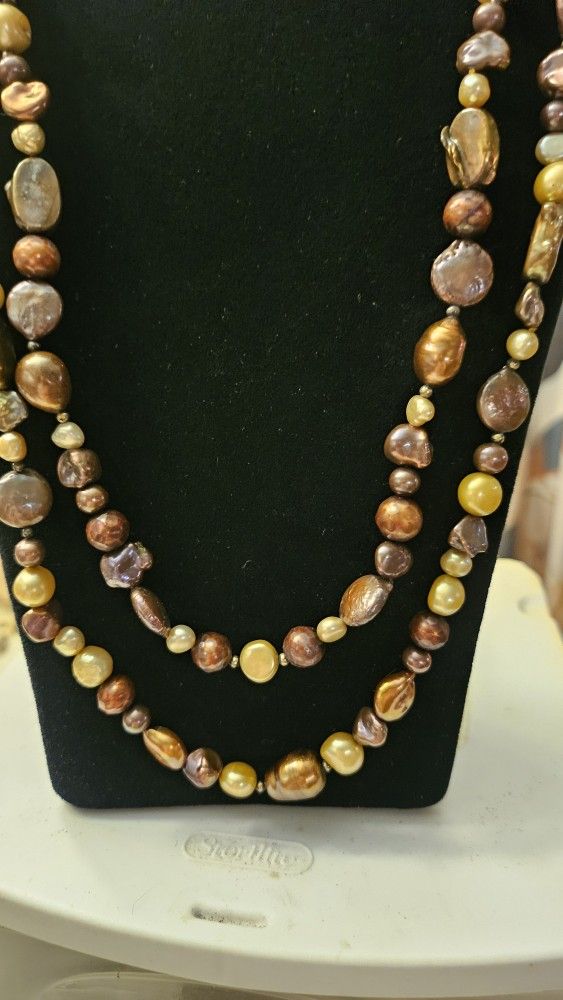 Beautiful double strand, fresh Water Cultured Pearls, enhanced colors, burgundy, bronze, gold, and brown, different shaped Pearls, coin,round, and flat rectangular, longest strand 28in. Shortest strand 25in.,18k overlay sterling silver lobster claw clasp. Very attractive!!