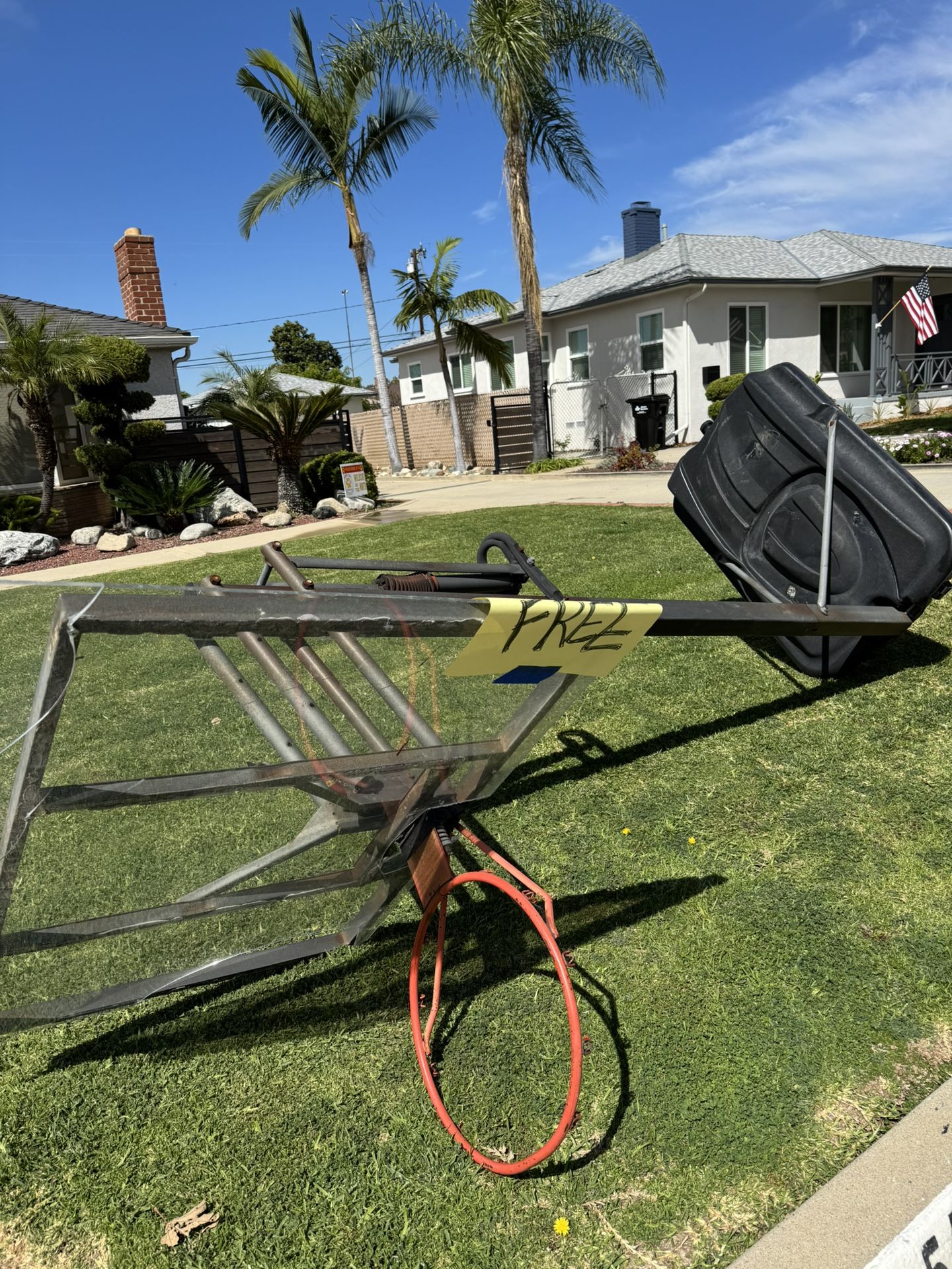 Adjustable up to 10 feet. Backboard is cracked. Must provide own method of picking up and hauling away.