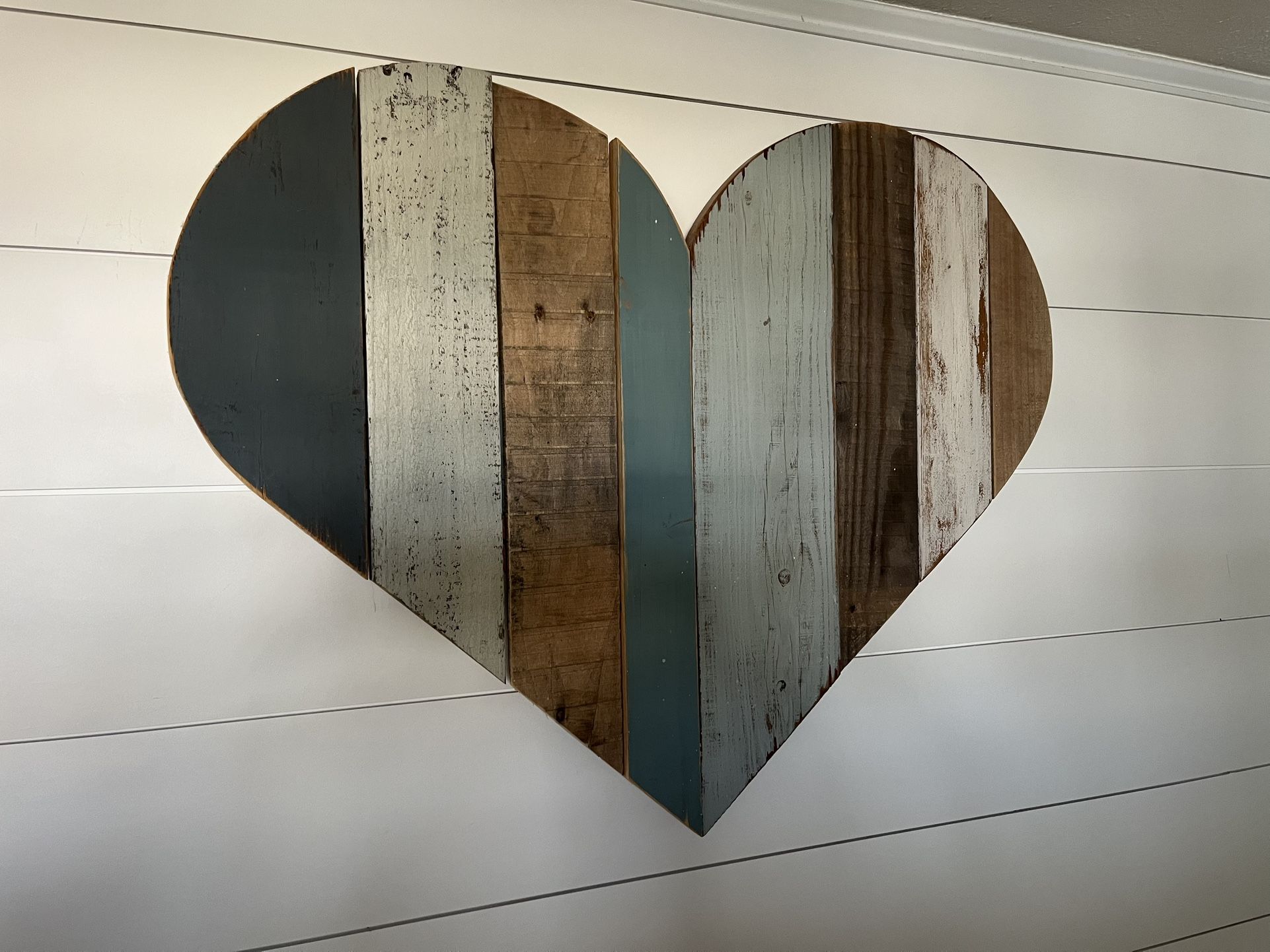 Large Hanging Wall Art, Heart Shape cut from wood planks, painted different shades of Blue/White/Brown