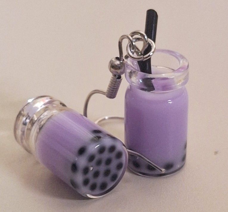 Ube-Taro Boba Handcrafted miniature Glass charm earrings are a unique blend of artistry and whimsy and handcrafted with care. Perfect for boba tea lovers and accessory enthusiasts, each pair is meticulously detailed to add a playful yet elegant touch to your style. Lightweight and comfortable, these earrings are sure to be a conversation starter! Excellent as a birthday present, anniversary gift, Mother's Day gift, Holliday gift, Valentines Day present, Graduation gift, and perfect for many other occasions! Earrings Boba charm jewelry handcrafted gift mizrulestudio