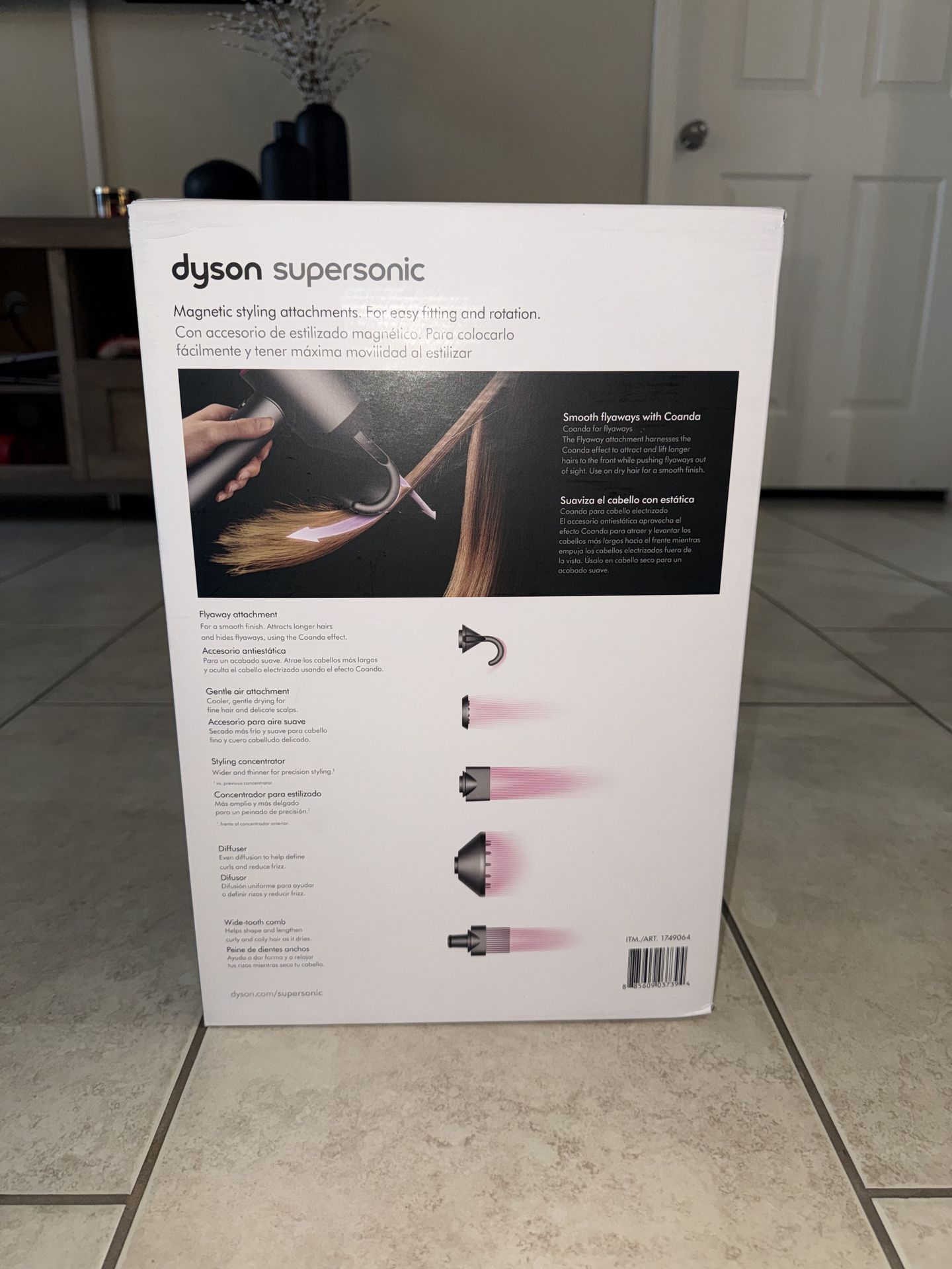 Brand New Never Open Includes: Dyson Supersonic Hair Dryer, Display Stand & Five Attachments Magnetic Attachments: Concentrator, Wide-Tooth Comb, Gentle Air Attachment, Diffuser & Flyaway Attachment Dyson Digital Motor V9 For Fast Drying & Intelligent Heat Control Engineered For Different Hair Types
