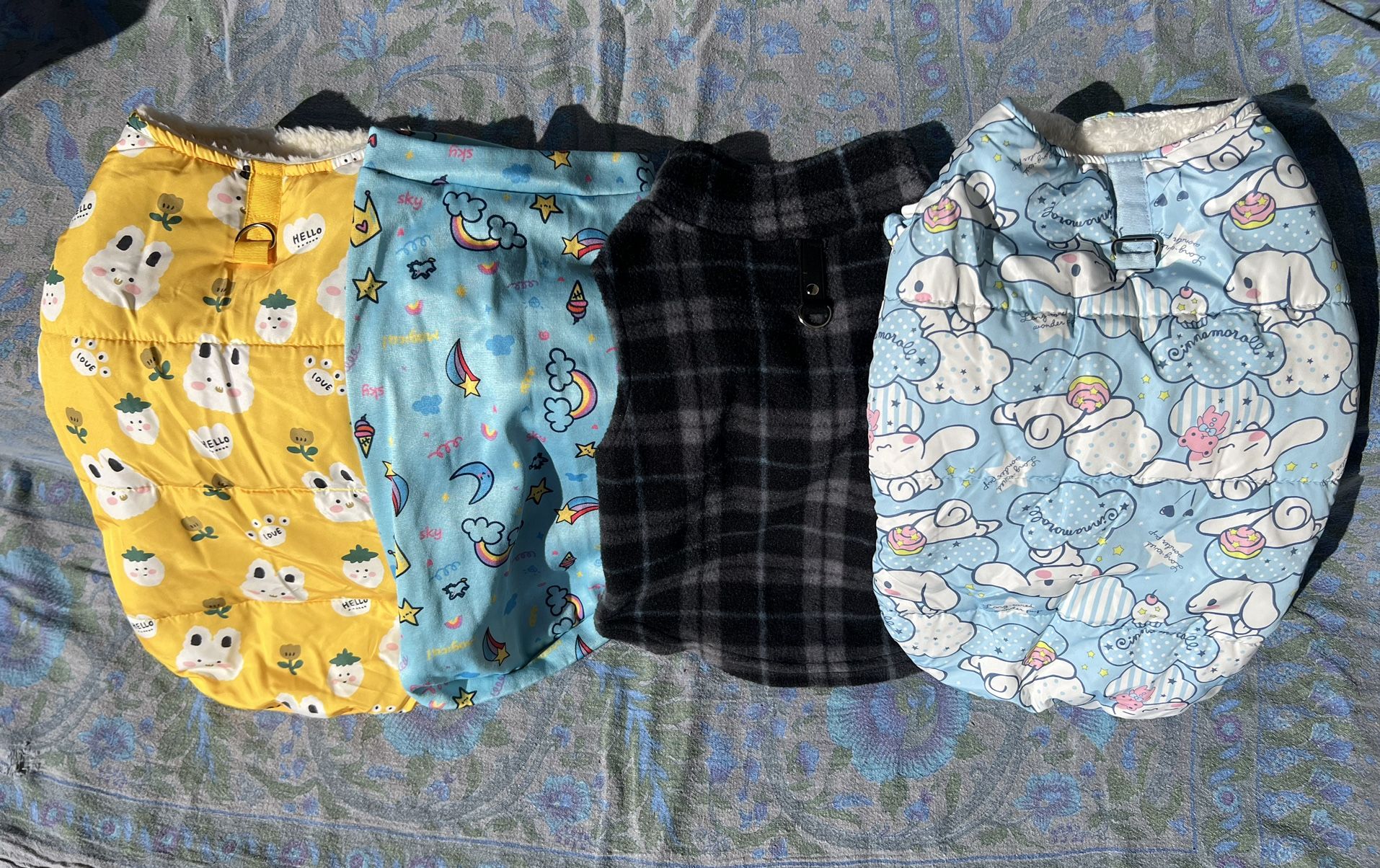 For a small medium size dog -25lbs ~22β chest girth Baby blue Cinnamonroll print, faux shearling lined puffer vests with ruffled sleeves and built in harness ππ§ Yellow bunny print, faux shearling lined puffer π° Mock neck sweater with shooting stars, rainbows, ice cream, crowns, unicorns and half moons. π π¦ Fleece vest with harness built in π€π©΅