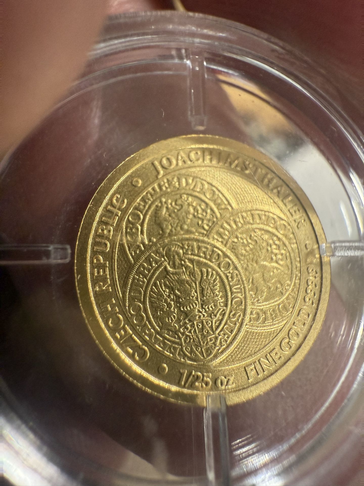 This coin is a 1/25th oz Czech Republic Joachimsthaler (Thaler) gold bullion coin, issued by the Czech Mint under the authority of Niue. The coin has a fineness of .9999 pure gold.