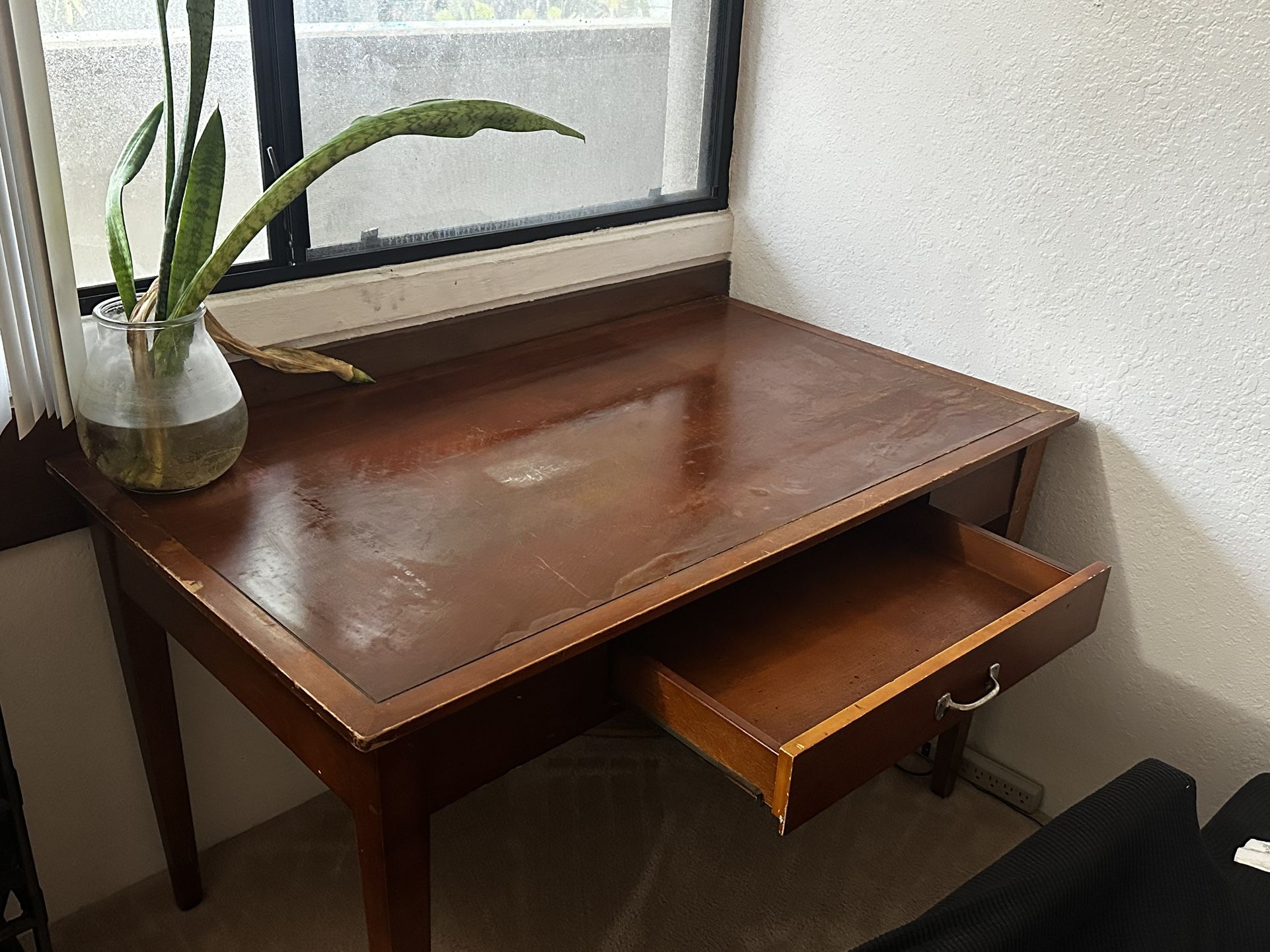 A very sturdy hardwood desk available. It has been perfect for school studies and a workbench. It is 50” wide 30”deep and 29.5” tall with a small drawer for files, keyboard, etc. Happy to help load it up and can be disassembled for ease of moving, lmk.