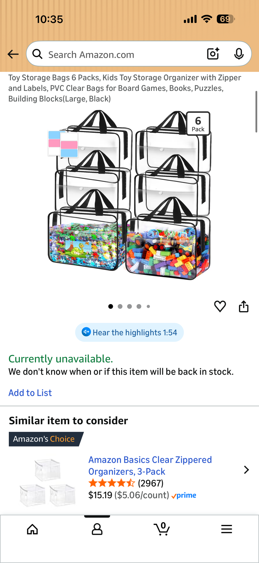 Toy Storage Bags 6 Packs, Kids Toy Storage Organizer with Zipper and Labels, PVC Clear Bags for Board Games, Books, Puzzles, Building Blocks(Large, Bl
