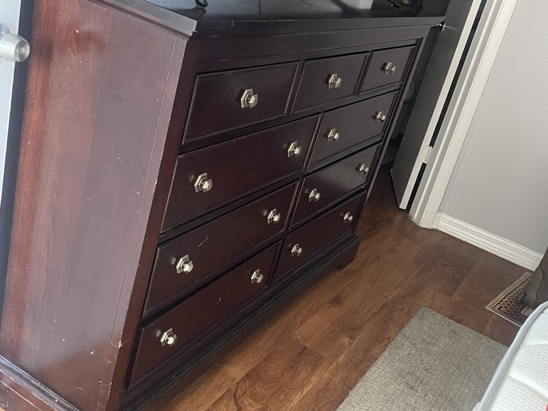 Beautiful dark cherry wood dresser with 12 drawers and modern silver handles. Perfect for bedrooms or guest rooms, offering plenty of storage space. The dresser is sturdy and in great shape