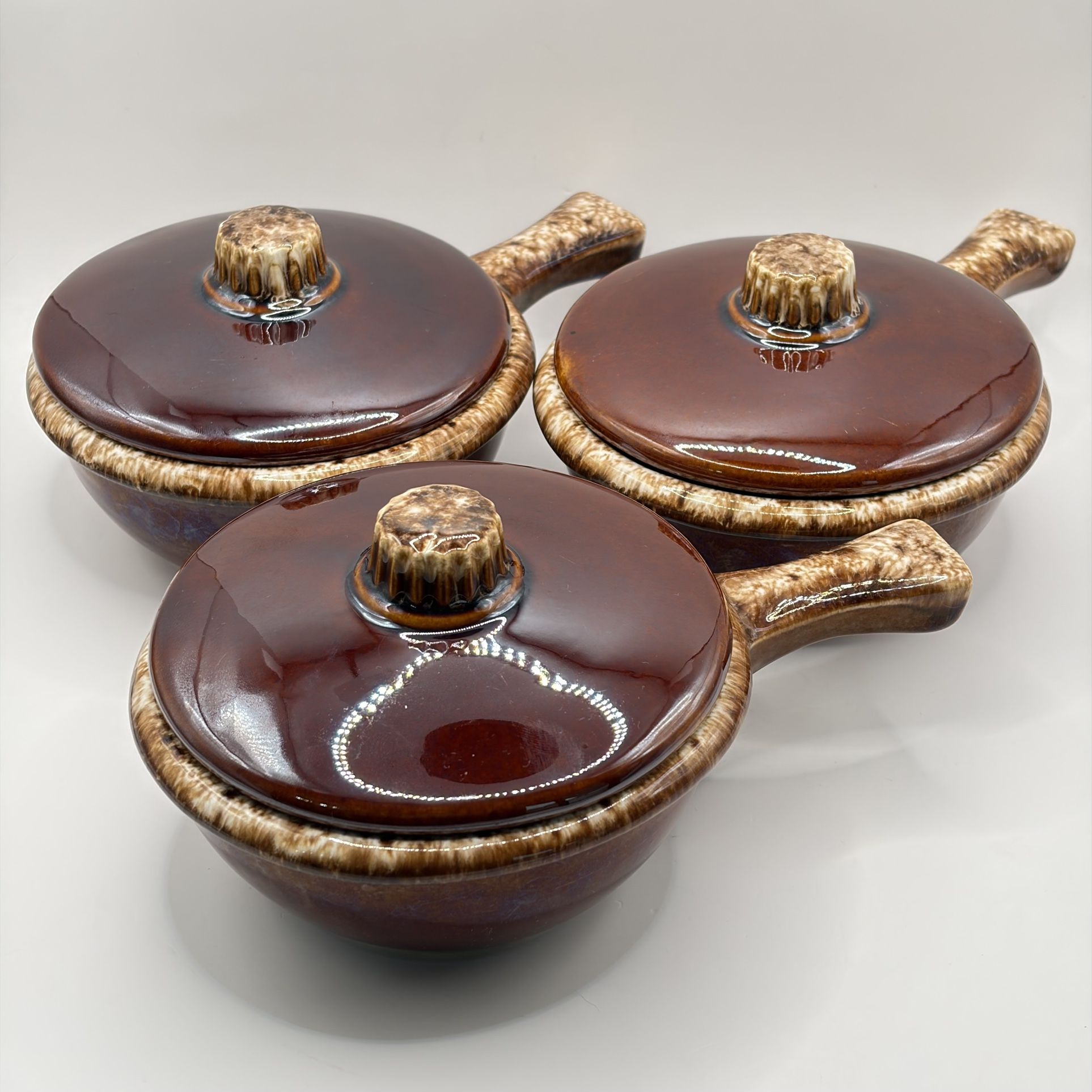 Set of 3 Hull Oven Proof Pottery Brown Glaze French Onion Soup Bowls with Lids