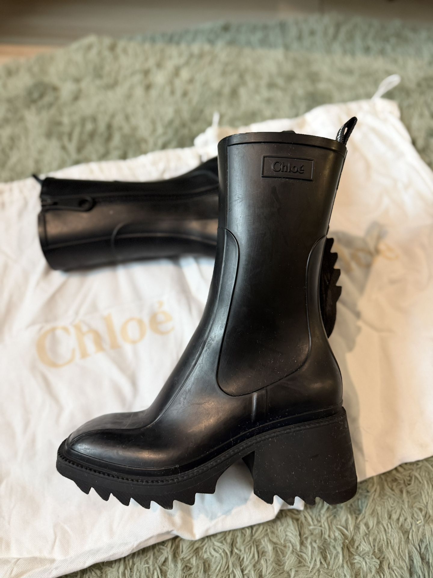 Slightly scuffed Chloe Betty Rain Boot with dust bags. MSRP $695 Rain boot heel height: 2.8" (7 cm) Heel-to-toe drop: 2" (5 cm) - Upper: Rubber - Sole: Rubber - Lining: Elastane - Heel: Rubber Please note: these boots are crafted primarily from fully waterproof rubber, which is a soft material that is easily scratched. European fit - Waterproof rain boot - Oversized internal zipper Pick ups in Queens/Manhattan