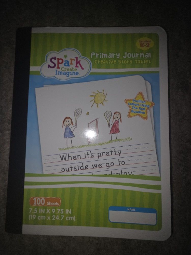 This is a Spark Create Imagine Primary Journal Creative Story Tablet designed for grades K-2. X1 $6 new It contains 100 double-sided sheets, with the top half of each page blank for drawing and the bottom half primary ruled for writing practice. The pages are designed with a dashed midline and a red baseline to help children with proper letter formation and handwriting development. The overall dimensions of the journal are 7.5 inches by 9.75 inches (19 cm x 24.7 cm). It is suitable for young students in kindergarten through second grade to develop creative writing and storytelling skills.