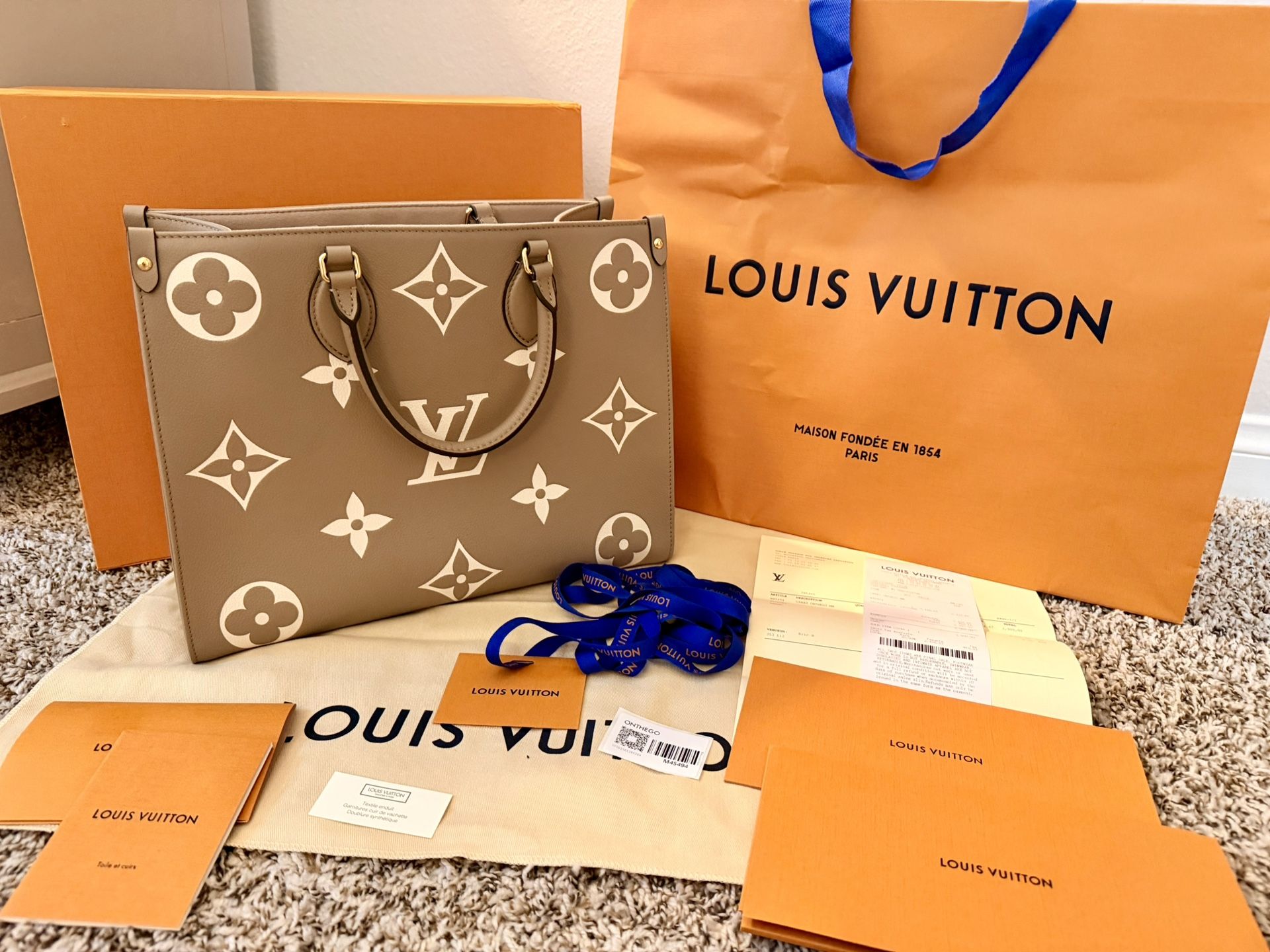 Brand new Louis Vuitton bag, 100% authentic. Comes with all original documents, dust bag, and packaging. Never worn — in perfect, pristine condition. This is a timeless, elegant piece that would be a beautiful addition to your collection or a truly special gift for a loved one. ✨ The OnTheGo MM is a medium-sized tote bag with two sets of handles, long and short, for hand and shoulder carry. Fashioned from supple grained cowhide leather, it features a Monogram pattern, printed on and embossed into the leather. The spacious interior, which can hold a laptop and other work essentials, make it a versatile everyday bag. 13.8 x 10.6 x 5.5 inches (Length x Height x Width) Tourterelle Beige/Cream Embossed grained cowhide leather Grained cowhide-leather trim Microfiber lining Gold-color hardware Inside flat zipped pocket Inside double pocket 2 long leather shoulder straps (drop: 24 cm) Fits: 13-inch laptop, smartphone, keys, Zippy Long Wallet, earphones Handle:Double This reference is either Made in France, Spain, Italy or in the US.