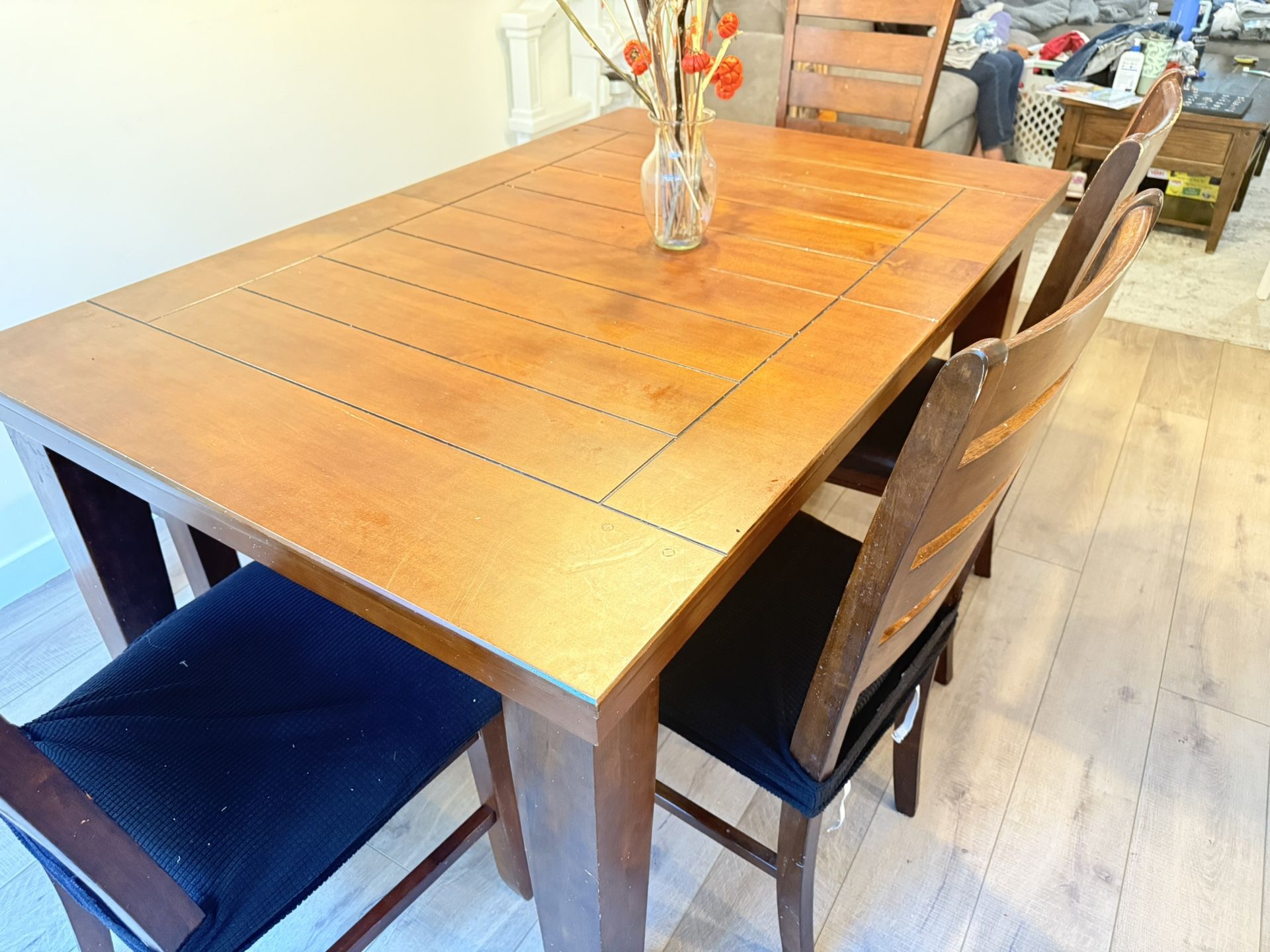 Solid wood dining table set in good condition. Beautiful plank-top design with a warm medium-brown finish — classic farmhouse/transitional style that works with just about any decor. Table measures 64" long x 36" wide — seats 6 comfortably with the included bench and four chairs. The table itself is in excellent shape with a sturdy, heavy build (this is real wood, not particle board or veneer). The chair frames are solid and sturdy — seat cushions show normal wear and could use recovering, which is a quick and inexpensive DIY project. Set includes: * 1 dining table * 4 chairs * 1 bench with cushioned seat Priced to sell — serious offers only, no trades. Pickup only.