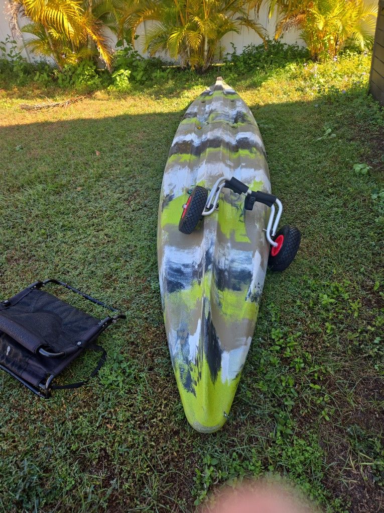 Fishing kayak has seat with fusion, storage, rod holder ,paddle,life vest , small patch and kit .no leaves. Has wear from beaching but padded it.
