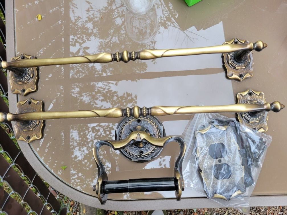Brass set of bathroom fixtures 2 towels bars hangers 1 toilet paper hanger 2 switch plates with hardware Looking very well, lightly used in our half bathroom. Pick up from Bloomingdale IL