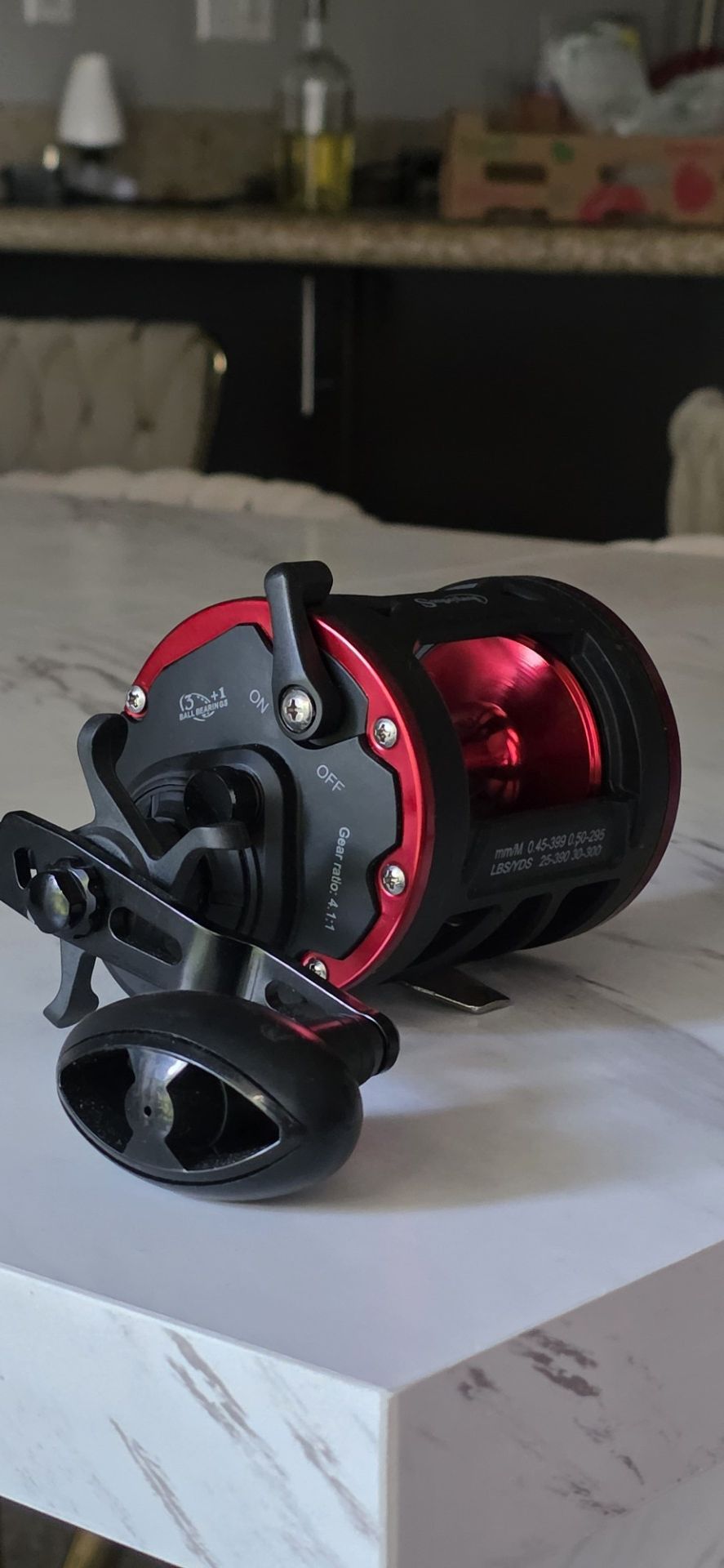 Brand New Sougayilang DTR 40L Size 40 (Meadium-Heavy) Duty Left Hand Retrieve Gear Ratio 4.1:1 (Slow, Very Powerful) Bearings 3+1 (Anti-Reverse - Yes) Line Capacity 900 Feet (274 Meters) High torque at low speed made for Sturgeon, Tuna, Amberjack and Chupakabra. Some say this reel was used to catch a submarine… And that it doesn't catch fish it just applies for custody and wins.