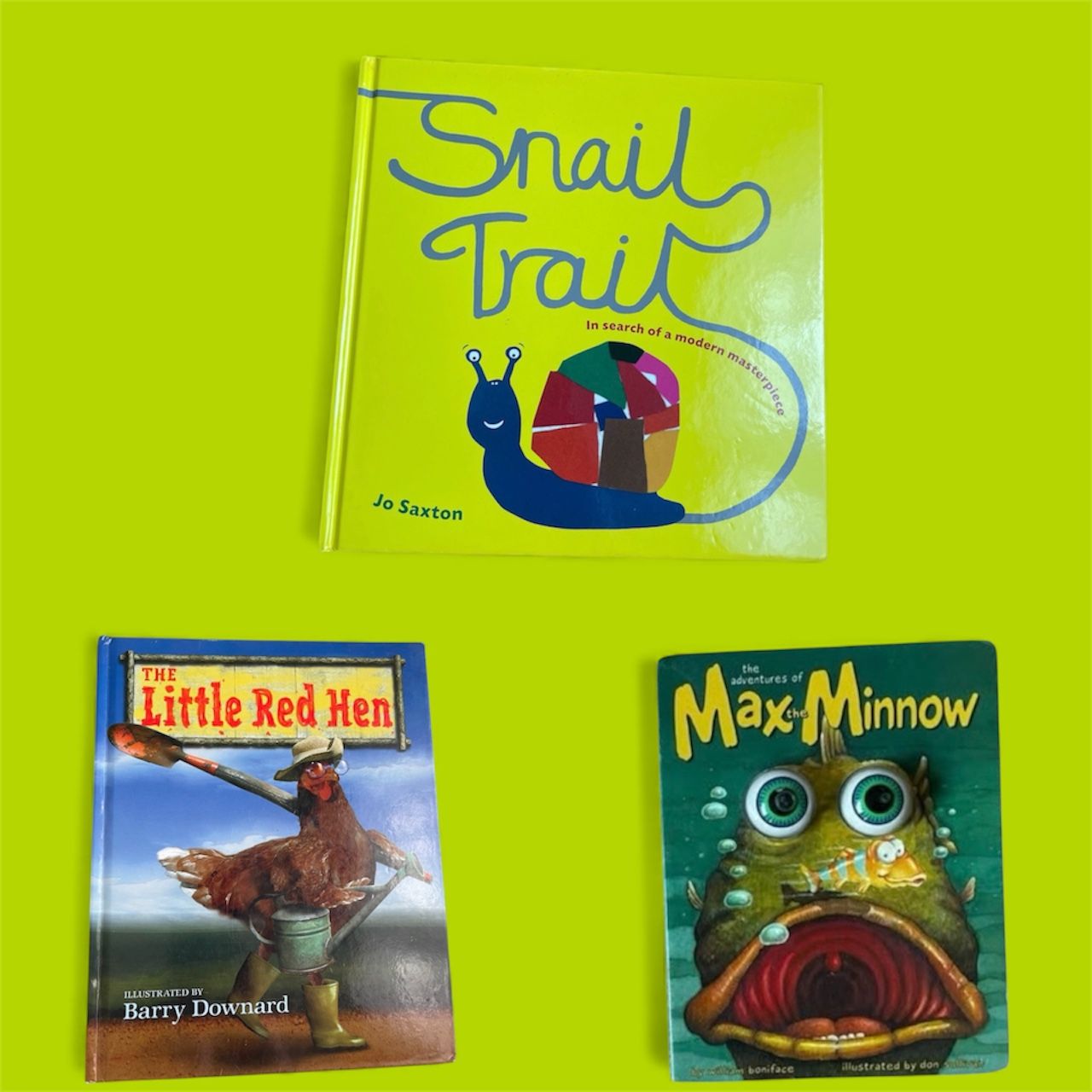 Lot of three children’s books * Snail Trail (In search of a modern masterpiece): A children's book about a snail's journey or search for a masterpiece. * The Little Red Hen: This is a well-known classic folk tale about a diligent hen. * The adventures of Max Minnow: This book follows the adventures of a character named Max Minnow, an aquatic creature.