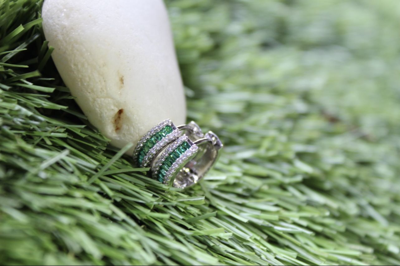 Really pretty sterling silver hoop earrings with bright green stones and clear accents that sparkle nicely in the light. They’re super easy to dress up or wear casually, so they go with almost anything.