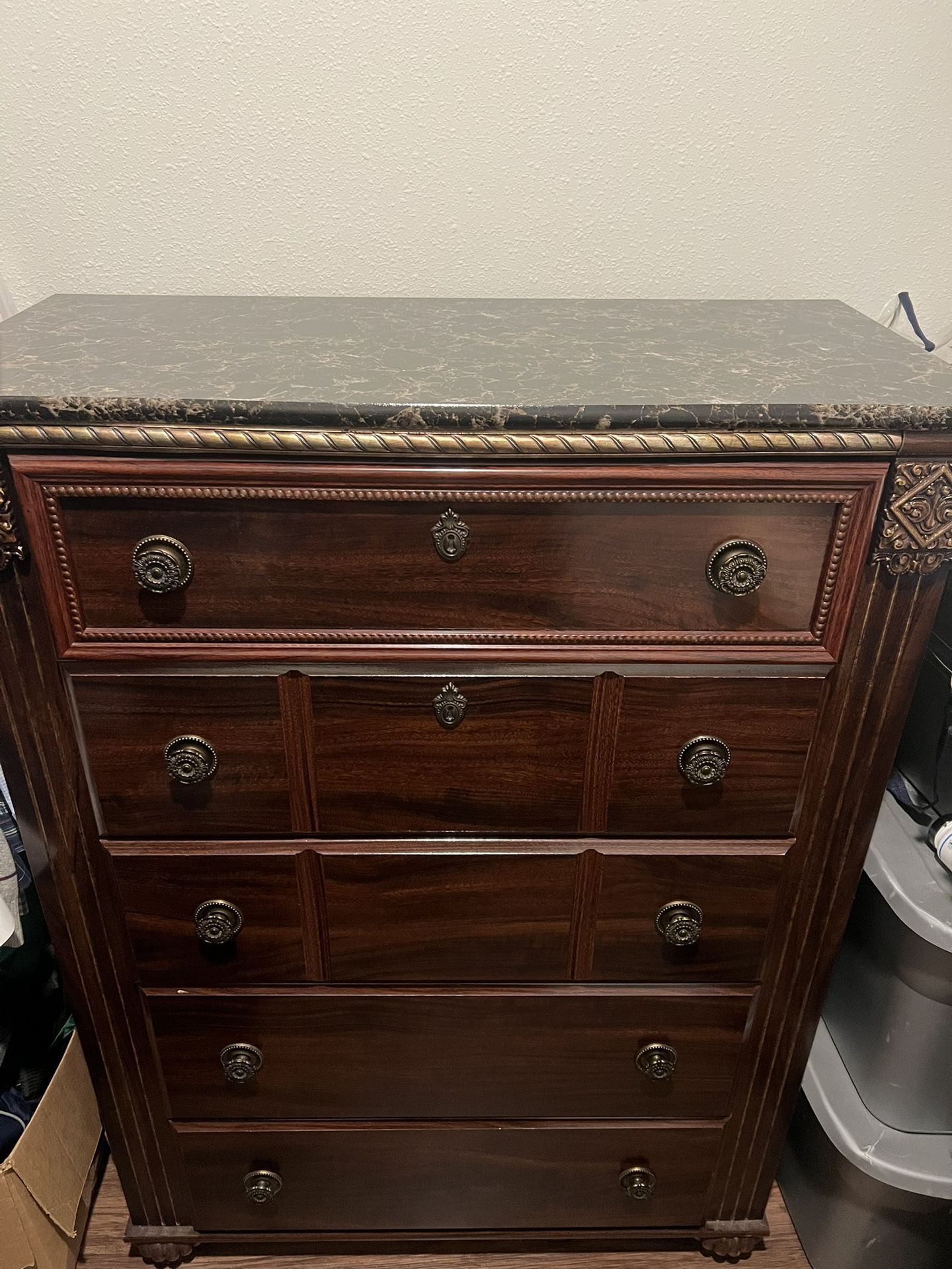 Elegant Storage Chest, Brown Tall Dresser, Marble Top