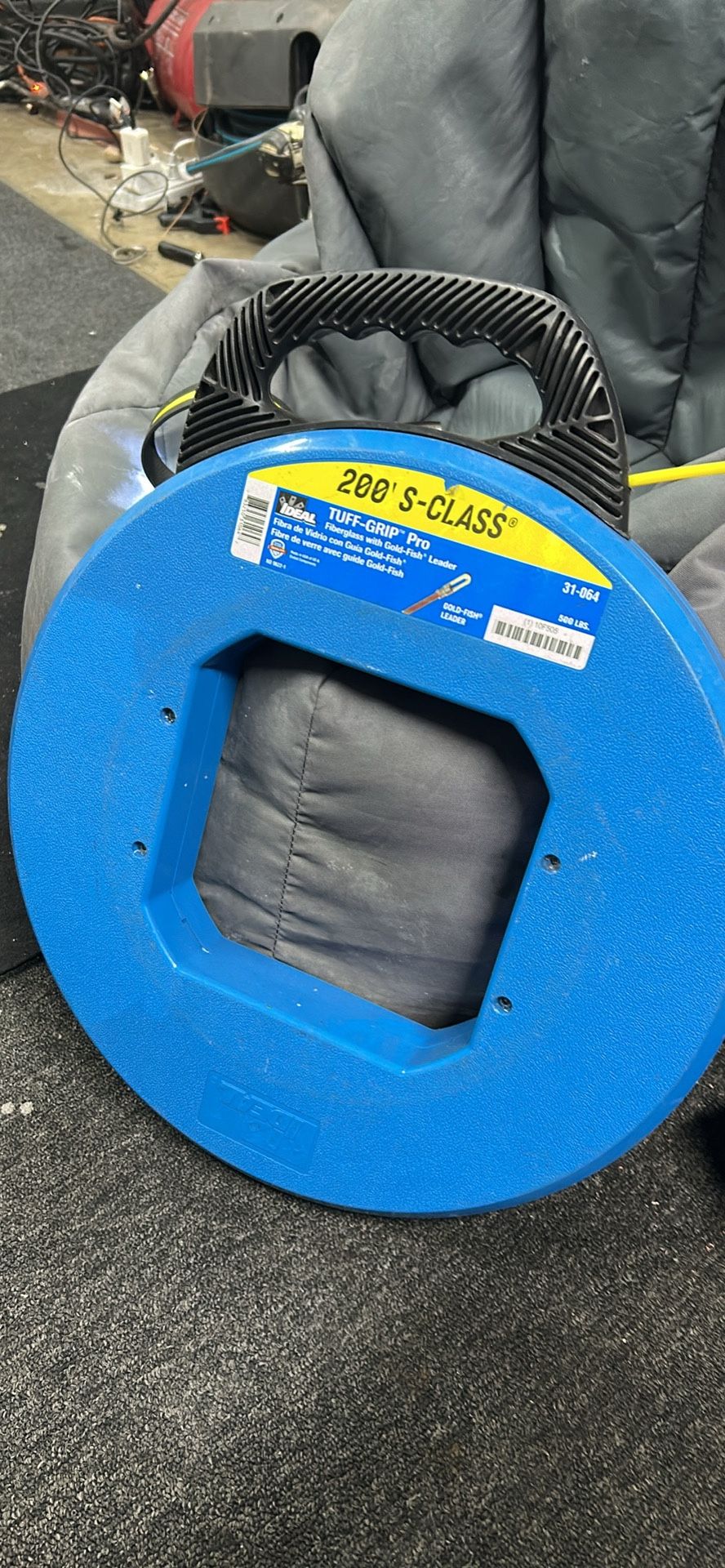 Tuff-Grip Pro 200 ft. S-Class fiberglass fish tape (model 31-064). Length: 200 feet (60.96 meters) Material: Non-conductive S-Class fiberglass core with a smooth nylon jacket, making it safe for use near live circuits. Pulling Strength: Delivers a 500 lb. pulling strength. Features: Includes a flexible "Gold-Fish" leader for guiding wires and an impact-resistant Tuff-Grip Pro case.