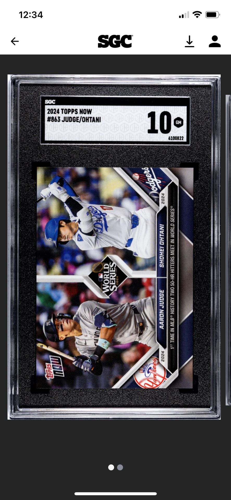 2024 Topps Now Judge/Ohtani #863 SGC graded 10 GM 1st time in MLB history two 50 -HR hitters meet in World Series near-mint or better condition.