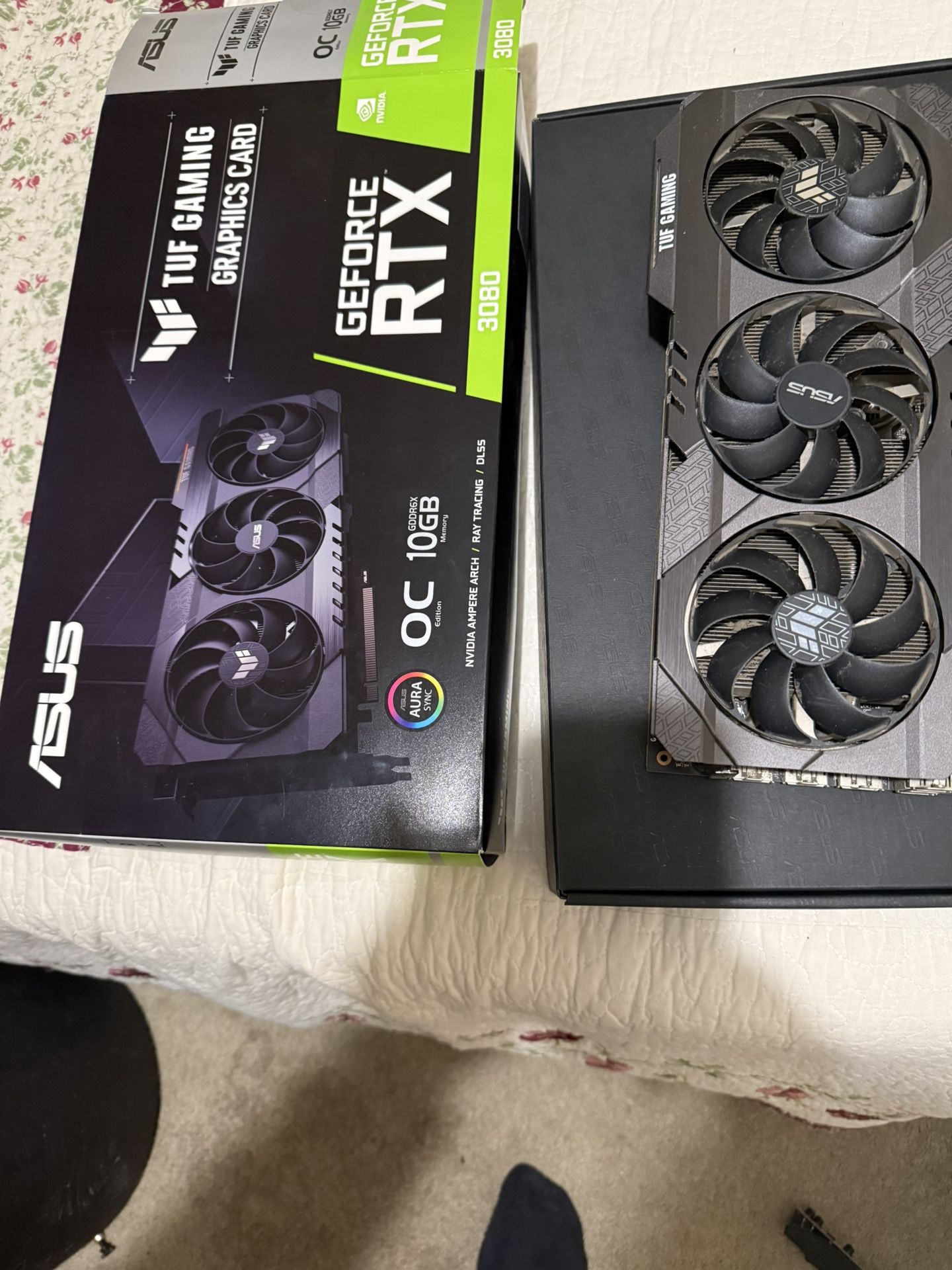 โ ASUS TUF RTX 3080 OC Edition - 10GB GDDR6X | Like New ๐ฅ Selling my ASUS TUF Gaming GeForce RTX 3080 OC Edition (10GB GDDR6X). This card is a powerhouse โ perfect for 1440p/4K gaming, video editing, or AI projects. ๐ง Triple-fan cooling (TUF design) ๐ฎ Boost Clock: Up to 1815 MHz (OC Mode) โก 10GB GDDR6X | PCIe 4.0 | Ray Tracing Ready ๐ฆ Includes original box and packaging ๐ No issues, runs cool and quiet โ never overclocked or mined with. ๐งผ Clean, dust-free, and ready to plug in. โ Local pick-up preferred (Highland/Redlands/San Bernardino area)