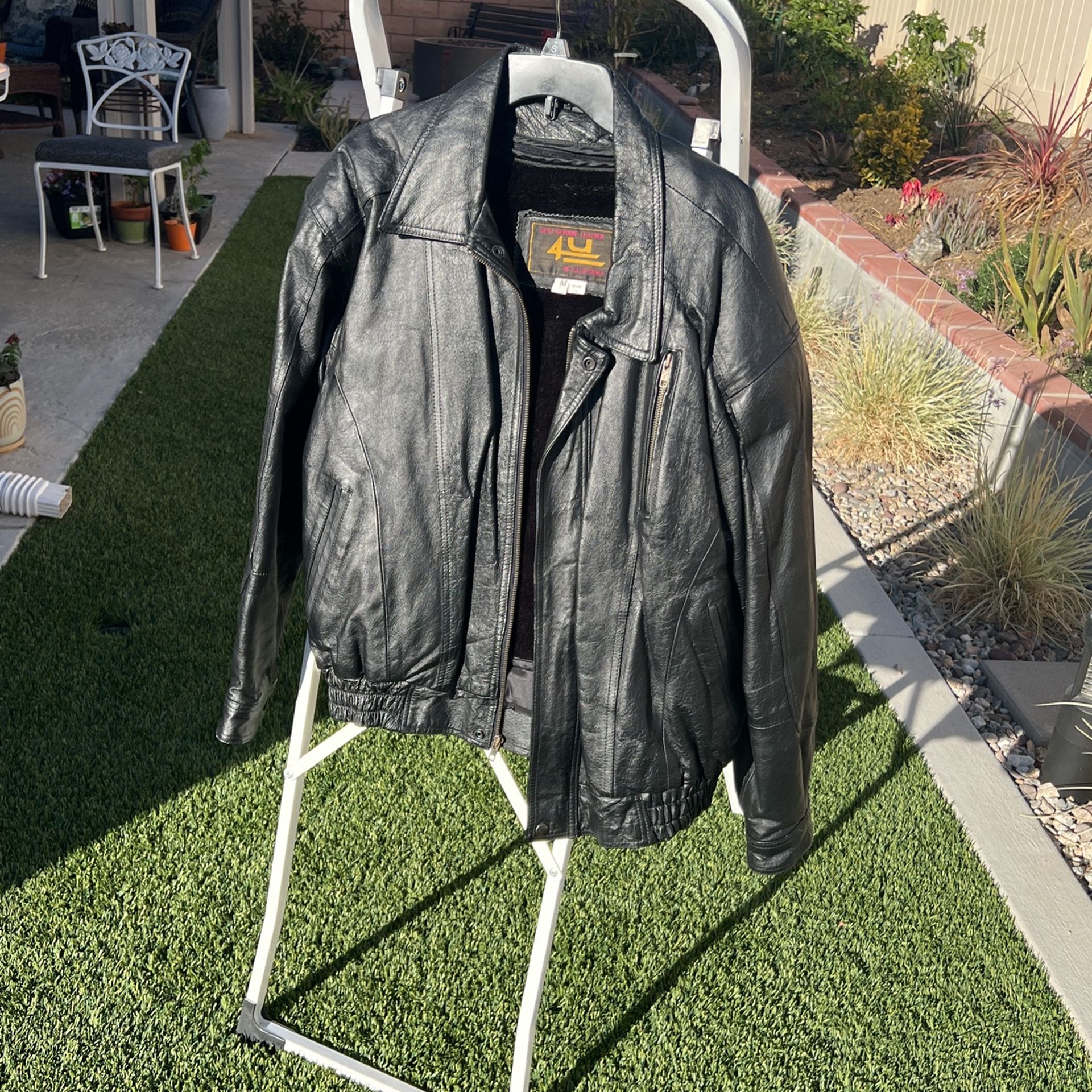 Zip front, zip inner lining, elastic waist, snap cuffs, 4 pockets (one interior). This is a very heavy leather jacket, lightly padded shoulders.