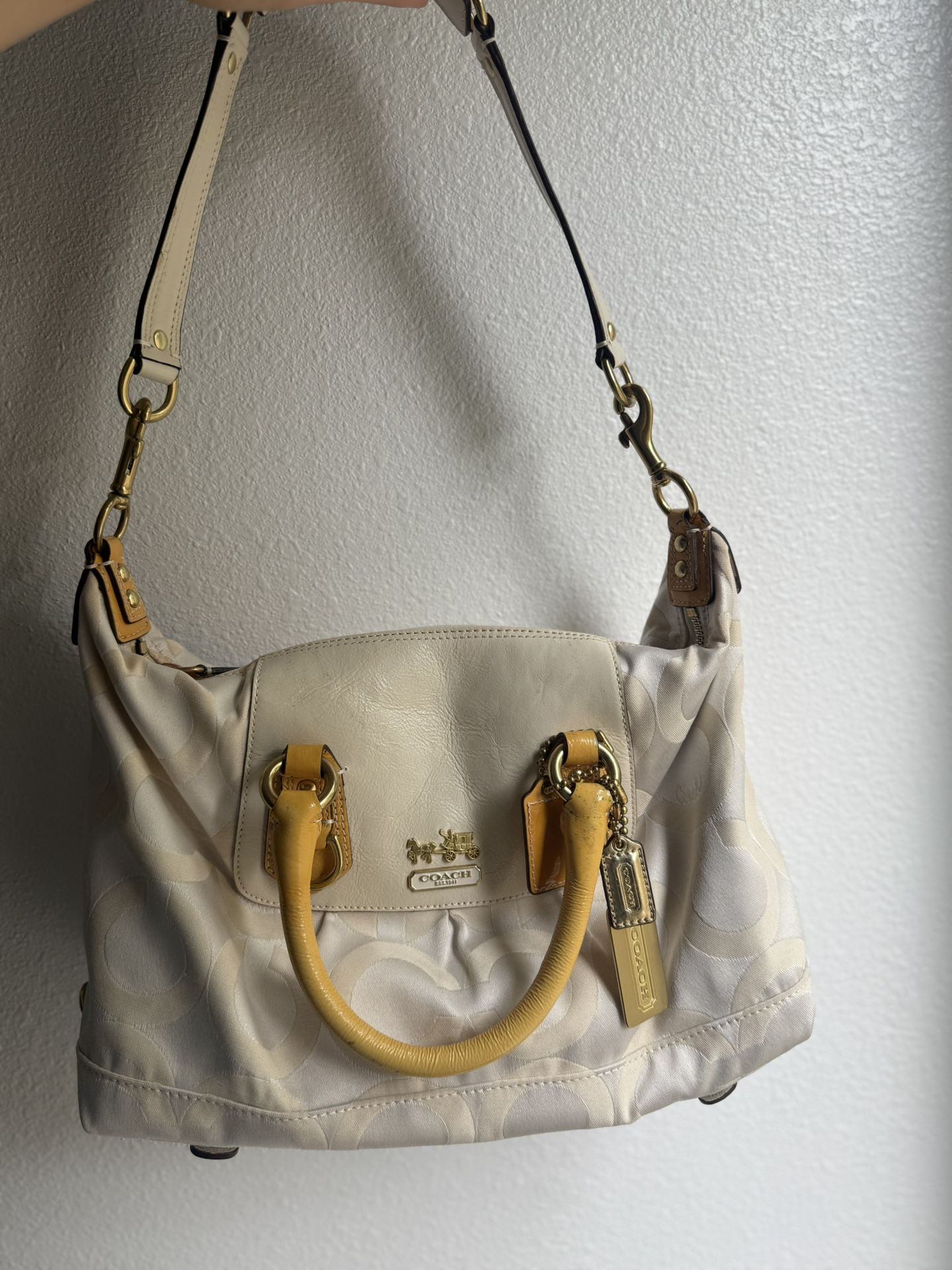 Vintage Coach, very good condition, no tears and very minor wear. The arm strap can be stored under the bag if you choose so.