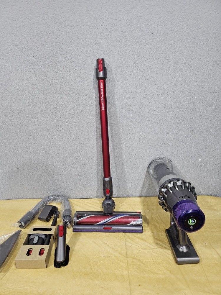 works great and looks near new. top-tier dyson cordless with 150% larger bin than the standard v11. delivers full corded vacuum power in a cordless setup. runs up to 60 minutes per charge. lcd screen shows remaining time and modes. three suction settings: eco, auto, and boost. easy-empty bin. comes with red quick-connect wand, oversized motorized head, charger, and 4-piece new attachment kit with flex wand. price set at $305.