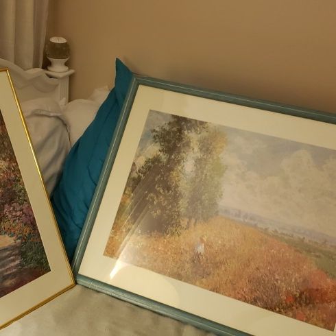 2 frames home decoration $10 for both Watch pictures and measurements One frame is in very good condition. The blue frame has a slightly scratched part, Watch picture. Sizes, The blue painting is 22 inches tall and 29 inches wide. and the gold frame is 23 inches tall and 20 inches wide.