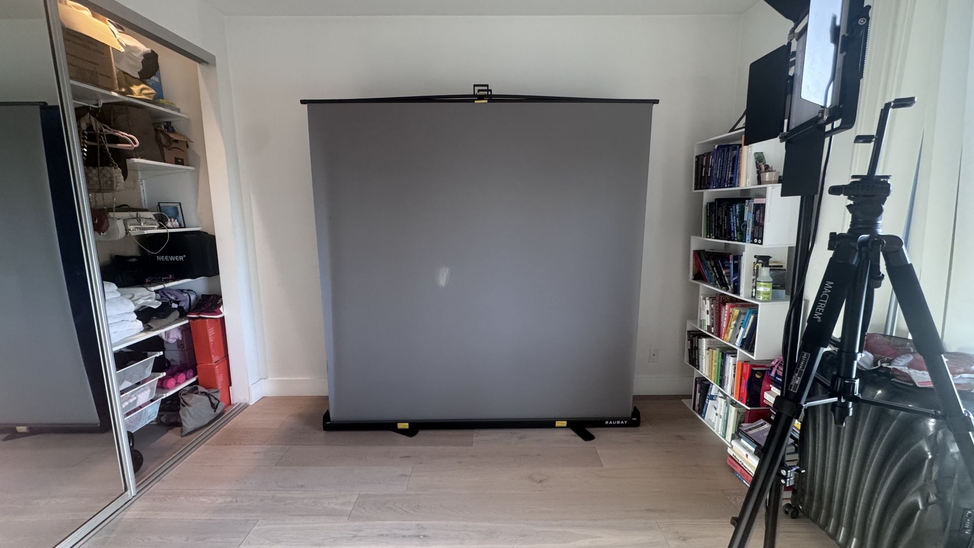 Portable RAUBAY gray retractable backdrop screen. This large 78.7 x 82.7 inch collapsible panel has a built-in stand. Good for video conferences, photography, studio work, or streaming setups. Pick up 90046.