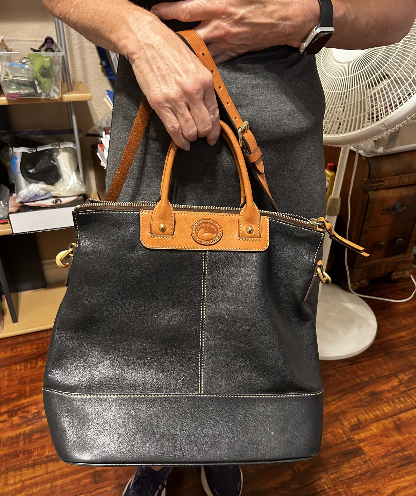 Black with Tan trim, 13” tall, (excluding straps) 13” wide at top 15 & 3/4” wide at base Gently used by me There is pen mark (see photo) Non Smoker