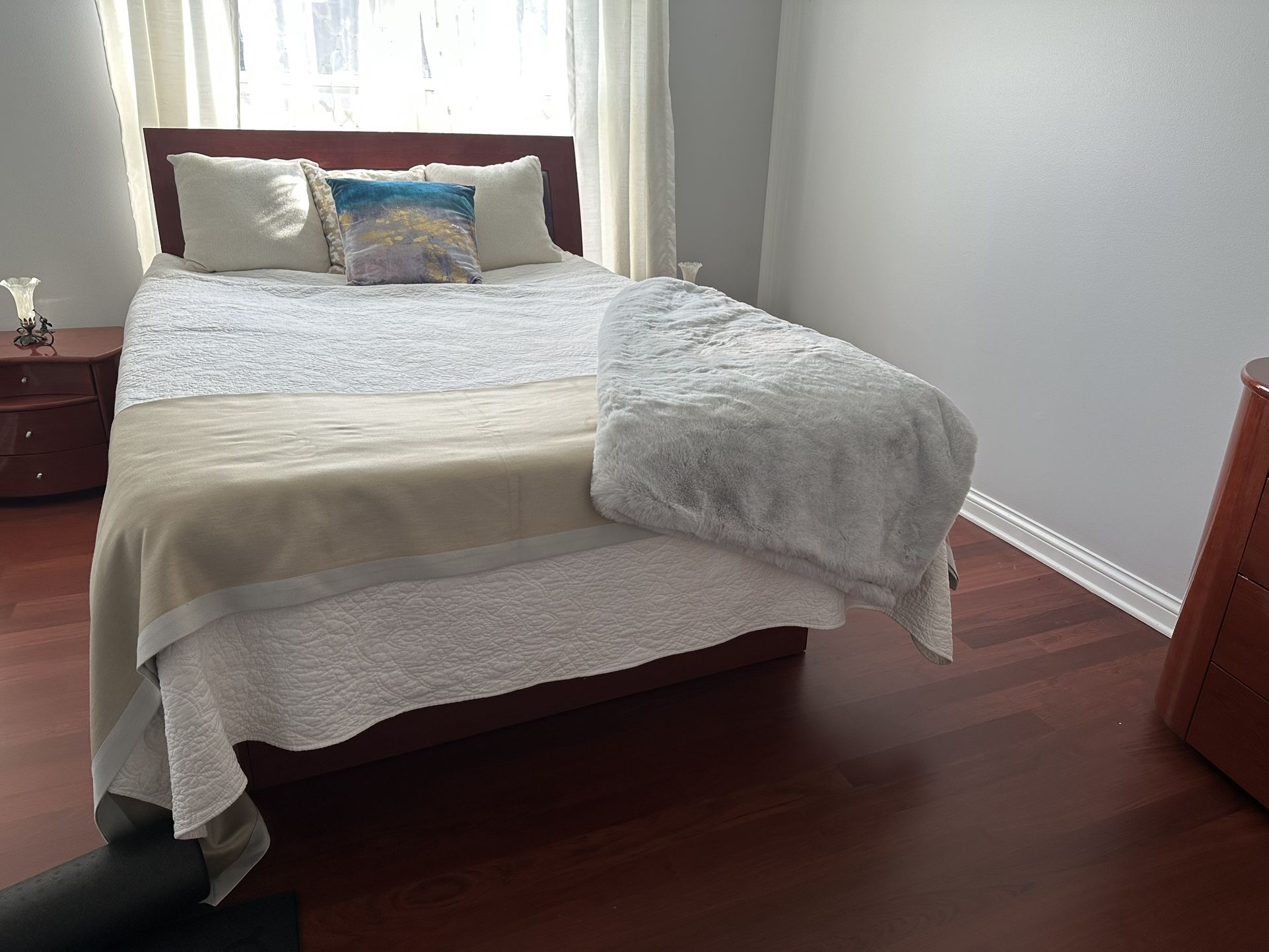 Great Strong furniture bed has six drawers Leather headboard It looks great in any room You will enjoy it Moving sale, look at our other listings and make an offer