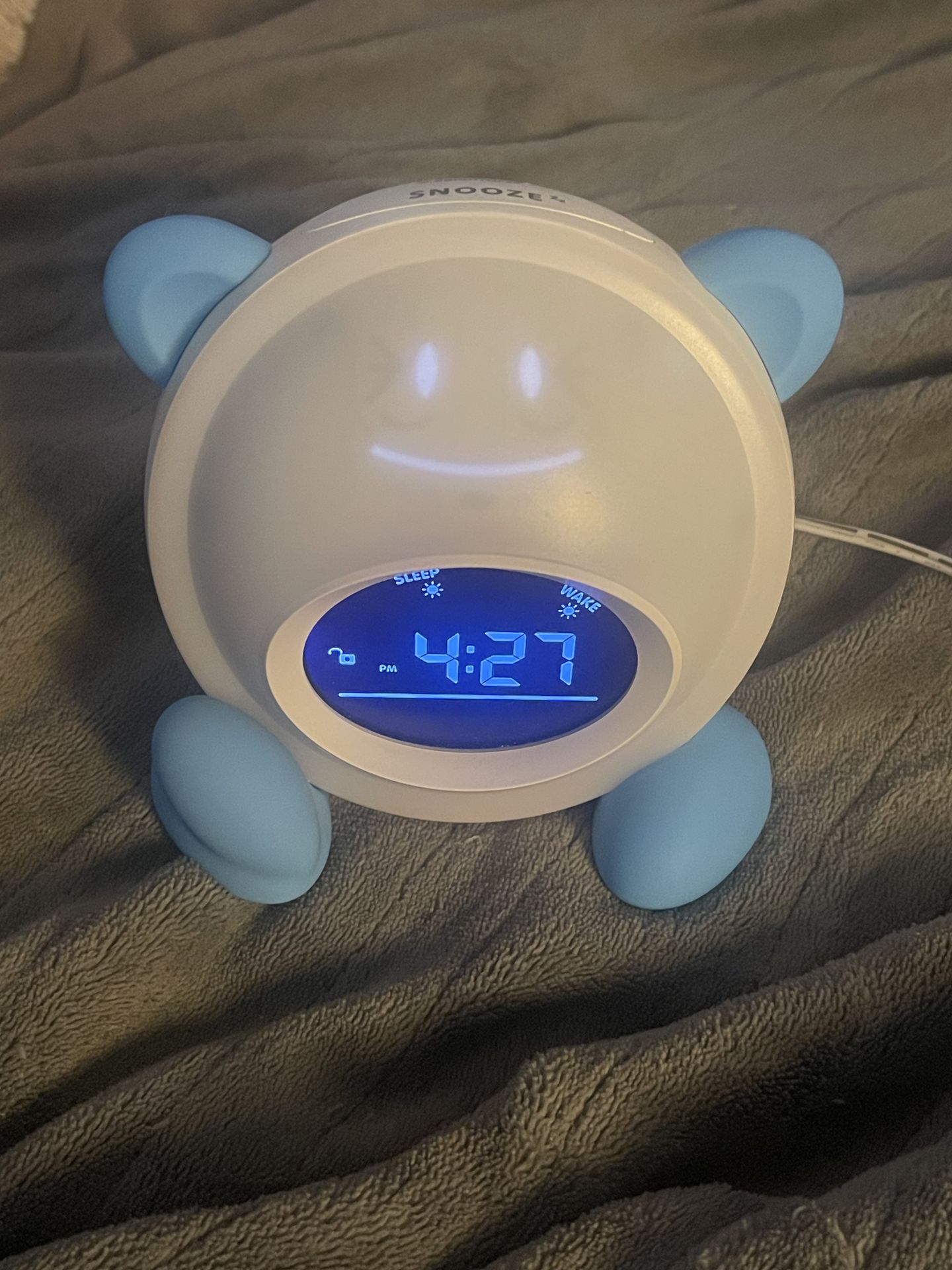 Ok To Wake clock $20.00 Pick up in North Everett OK to Wake Clock for Kids Sleep Training Not Just for Kids - Little Teddi features lively facial expressions and different light colors to signal a cycle of “sleep-play(optional)-wake”; It’s very easy for kids to notice and follow; So you can get your sleep back Multifunctional - More than an OK to wake clcok, Little Teddi is also a sound alarm clock and nap timer; Whatever features you need, this toddler clock has got you covered for years of using; It also saves your room space and decreases the risk of too many cords Child-lock and Settings Preserved - You need to long-press the lock button to unlock the panel, so it will be helpful to prevent curious little hands; The built-in battery is used to preserve memory settings in case of power outage; No need to reset it unless you want to