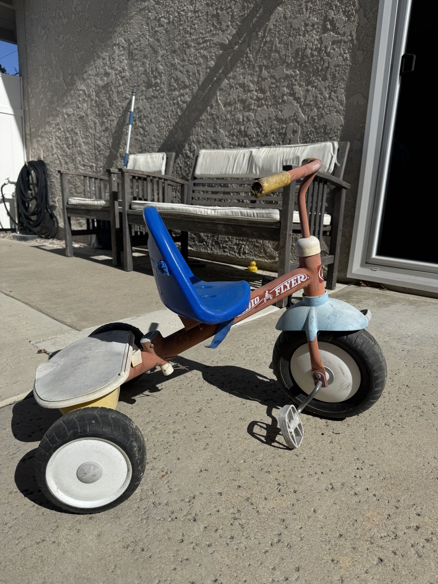 Kids Radio Flyer Tricycle This is a learning bike so for a kid just learning. Still sturdy. It has been sitting outside in sun so paint is faded. Still works well.