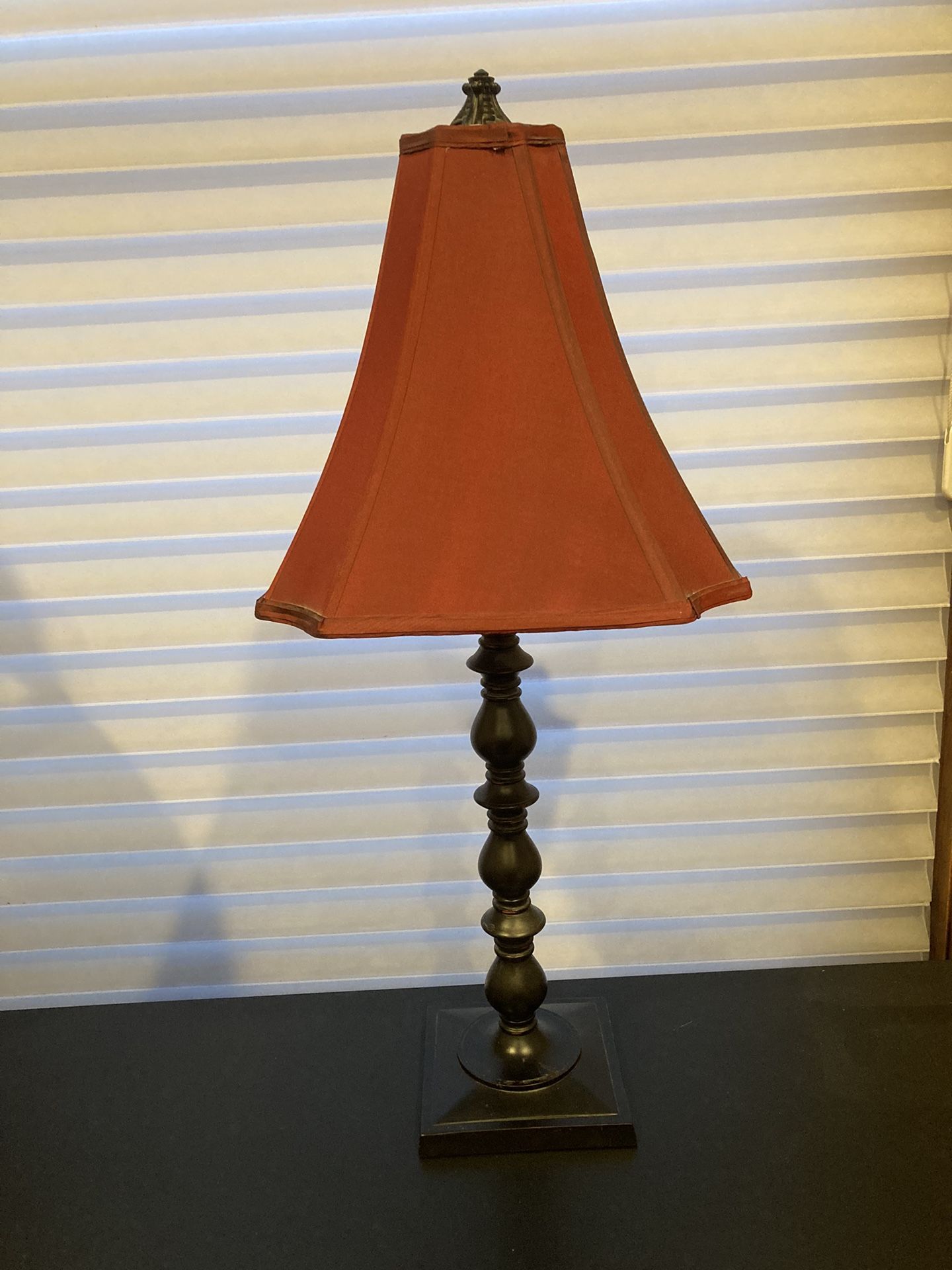 29” in height. One side of shade has a few black marks (as pictured). Lamp is fully functional. Smoke free, pet free home.