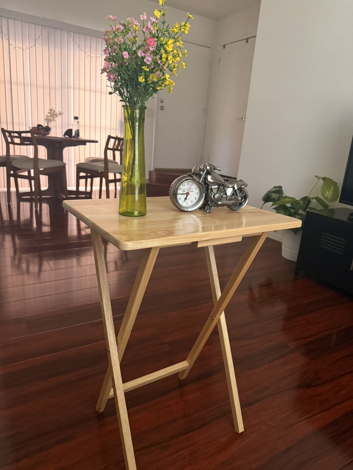 Selling this charming wooden folding side table along with the green glass vase with artificial flowers and a unique motorcycle-style clock. All items are in very good condition and have been a favorite corner setup in our home. ✅ Sturdy and lightweight foldable table ✅ Decorative vase with flowers adds a cheerful touch ✅ Stylish motorcycle clock – both fun and functional Reason for sale: Moving out of the country. This set adds warmth and character to any space – perfect for living rooms, bedrooms, or entryways. Total price: $25 for all items Pick-up in Burbank. Message me if interested!