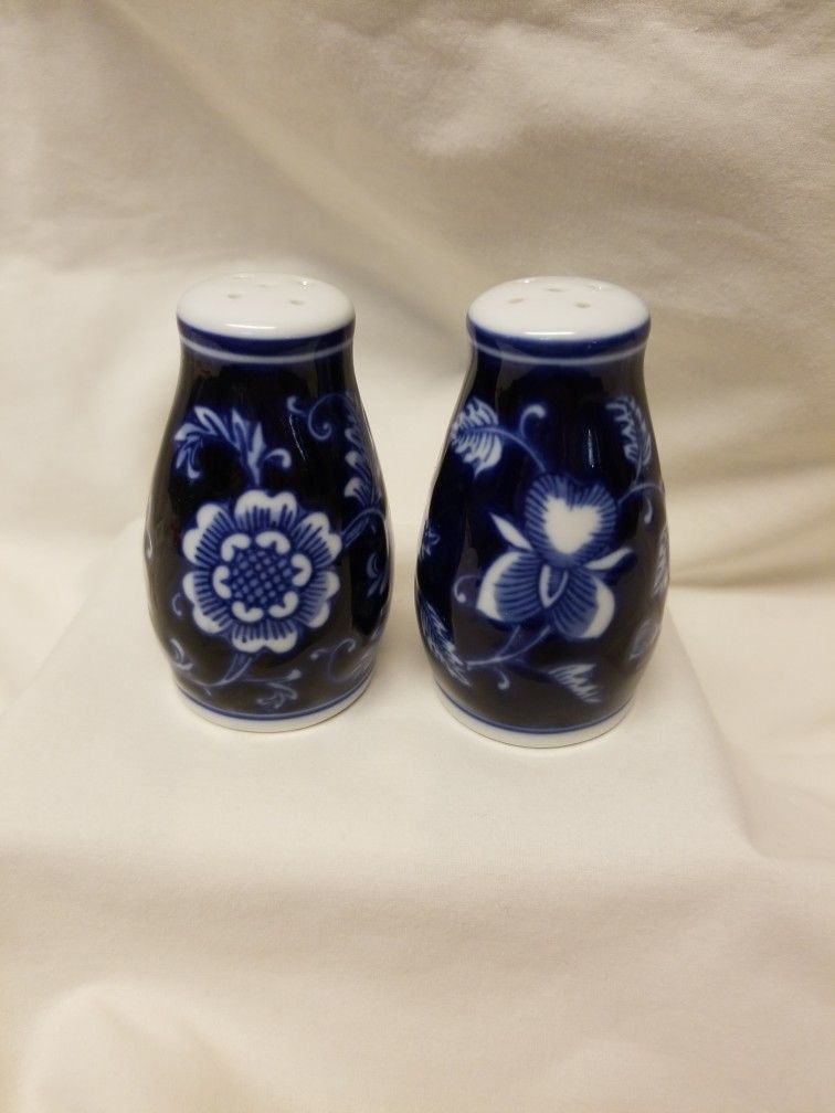 This is a set if pier 1 MANDARIN COBALT porcelain salt and pepper shakers (although they each have 5 holes on top) they each are about 3 1/2 in tall . $10 OBO cash only please