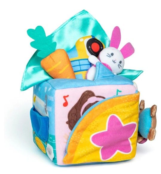 OFFICIAL MS. RACHEL SENSORY TOYS: Interactive “Surprise Box” with 4 learning environments and 6 plush accessories (teddy bear stuffed animal, bunny, bus, scarf, plush carrot and bubble gum) for sensory fun PEEK-A-BOO FUN: Lift the flap as babies enjoy the excitement of discovery play, pulling out surprises from the box and enhancing their grasp & fine motor skills by placing them in play environments VOCABULARY DEVELOPMENT: Encourage communication skills by saying, "What's in the box, what could it be?" as baby pulls out objects. Bonus learning card has even more play ideas and skill-building tips EXPERT-CREATED LEARNING TOYS: Crafted by Ms. Rachel and early learning specialists, these baby toys and toddler toys support crucial early milestones, aiding development from infancy through toddler years Includes: 1 Soft Box. 1 Satin Scarf, 1 Plush Bean, 1 Plush Bunny, 1 Plush Carrot, 1 Plush Bus, 1 Plush Gum, 1 Learning Card