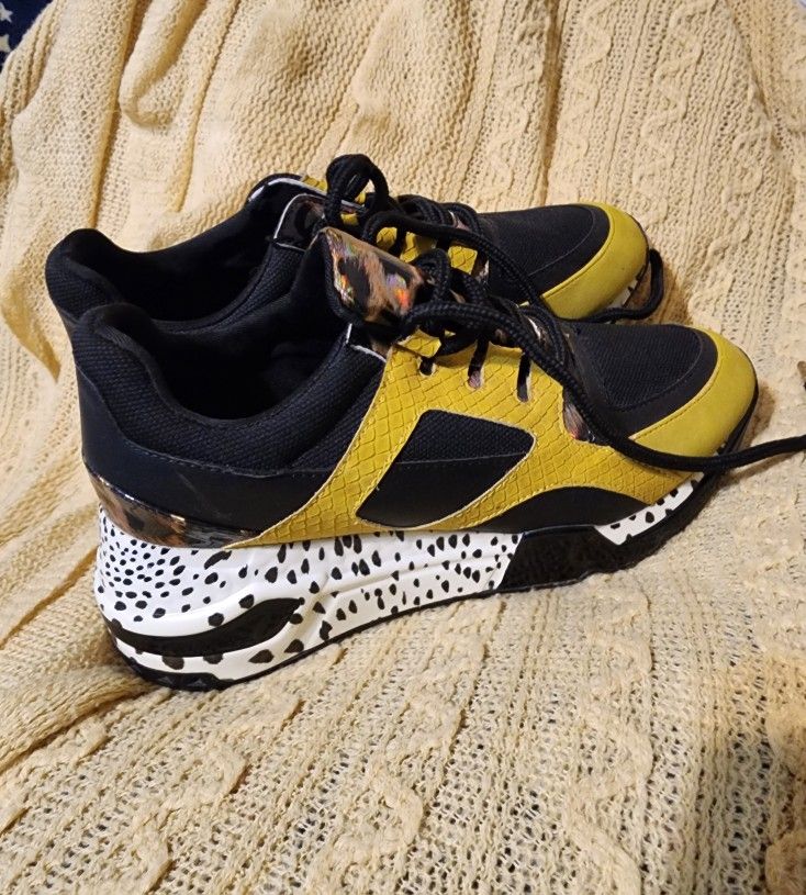 Steve Madden trendy sneakers with a bold black and yellow design. Features unique animal print accents, wedge sneaker. This is definitely a show stopper! These are off the shelf, no box. Aside from being tried on at the store, these have not been worn out. Please refer to all pics as I tried to capture bottom of sneakers where they had been tried on at store. Barely noticeable, but I am noting for full disclosure. Purchased on a whim and never wore them. Size 7. #tennis #sneakers #Stevemadden #trendy #animalprint