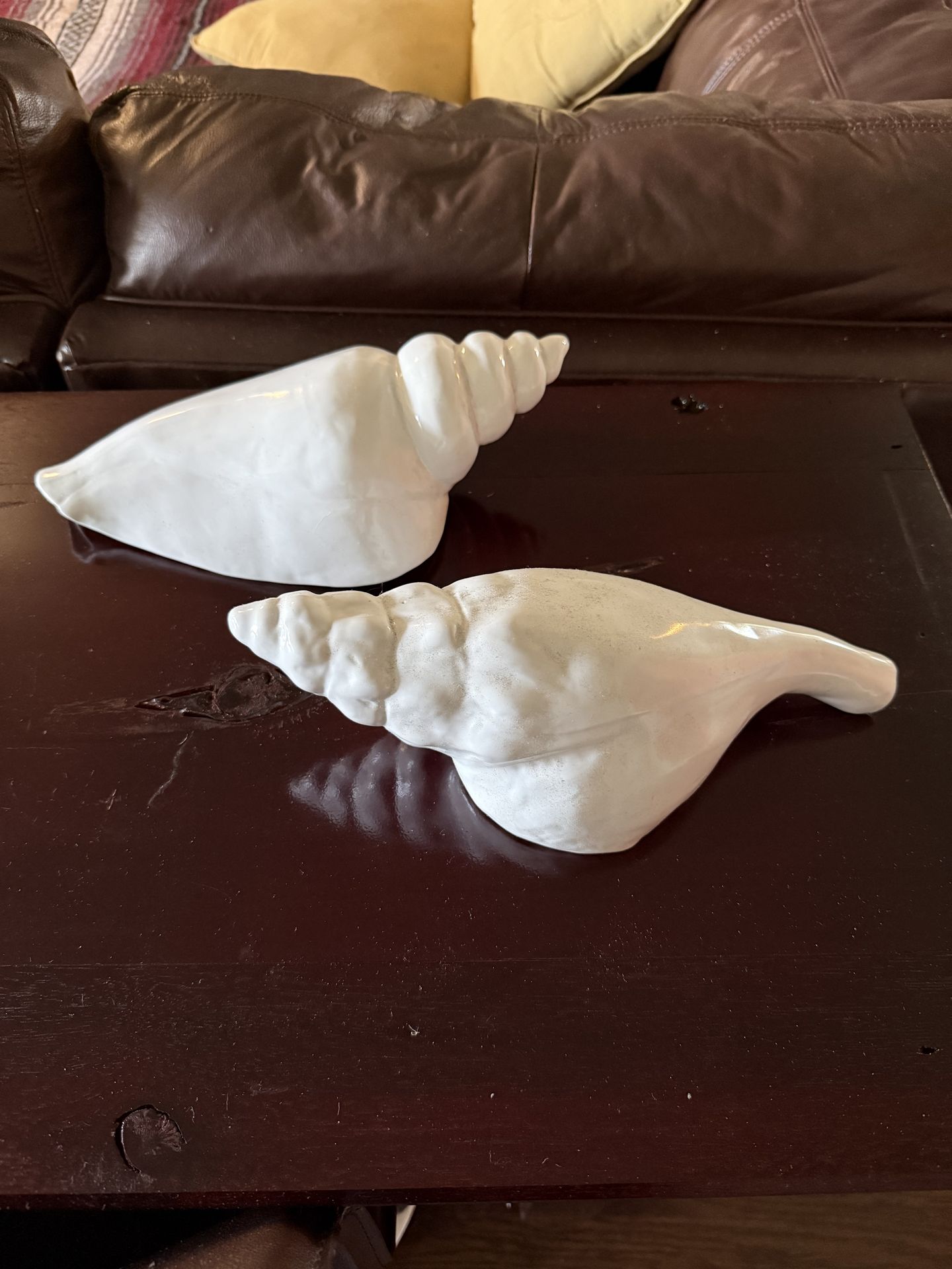 Set of 2 white glazed ceramic seashell figurines — conch style. Gorgeous matte/gloss white finish, heavy and solid. No chips, no cracks, like new. Perfect for a bathroom shelf, bookcase, coastal vibe living room, or beach house. The kind of thing you see styled in home decor magazines and on Pinterest boards. Both for $18. Pick up in West Boca. Please see my other listings for additional items.