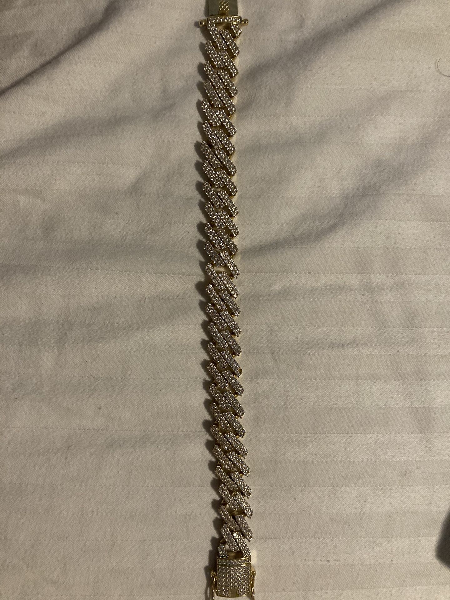 Selling iced out paved Cuban bracelet clean look it’s 925 sterling silver with 14k over it (gold plated) I used this kind for months I had it for almost a year no fade or green on skin no smell either! It’s a heavy bracelet it’s not does fake kind that u find at store this is like the real deal more questions send a message