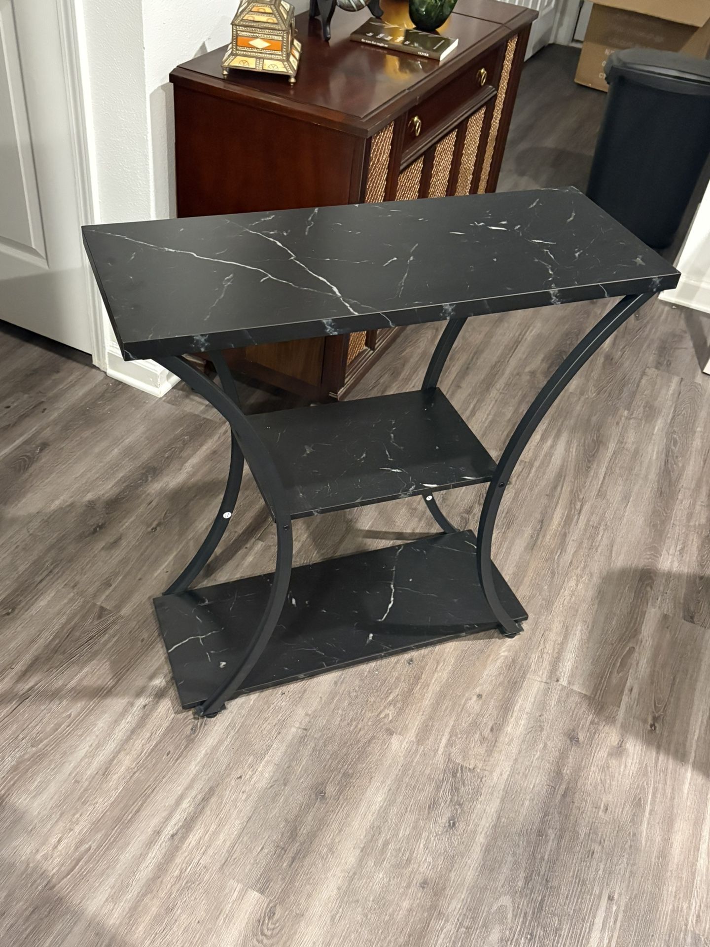 This is a cute 3 tier table made in metal and simulated marble. Just a few weeks old. I needed something to hold pictures, memorabilia and small plants. This worked great. Will also consider interesting trades.