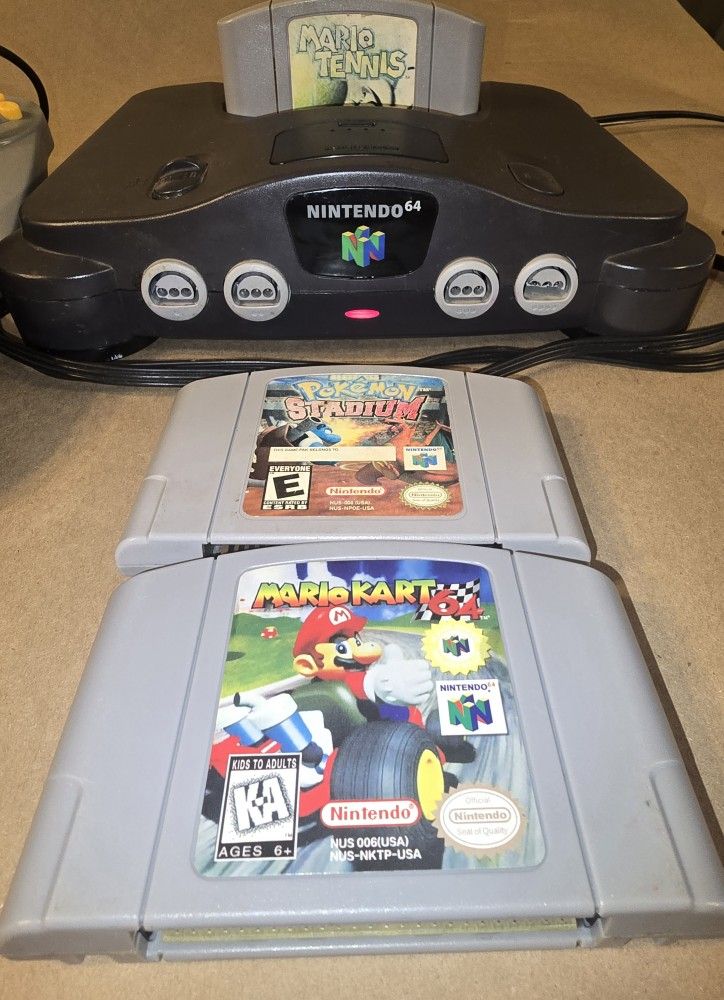 Selling a Nintendo 64 bundle in good working condition. Everything has been tested and is ready to play! Includes: Nintendo 64 console 2 controllers Power cord + AV cables 3 games: Pokémon Stadium Mario Kart 64 Mario Tennis Condition: Fully functional Controllers work well Normal wear from age One game label has some wear but works perfectly Great setup for anyone wanting a classic system without having to buy everything separately. 💲 $200
