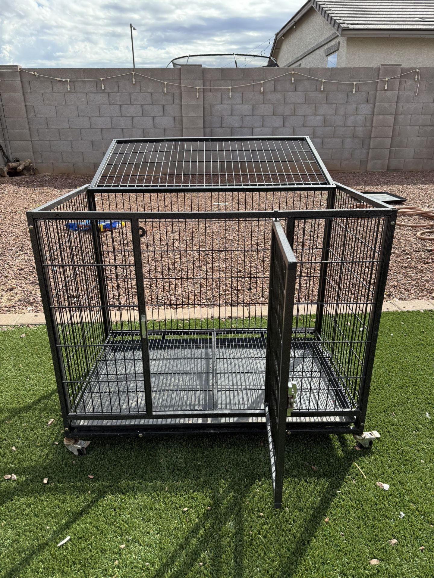 Heavy duty dog kennel . It sits in caster wheels for easy mobility. It is light weight and easy to clean. Will come with lower cleaning tray also for ease of cleaning. It is used but in really good condition. I paid 160$ for it. Asking 110$ obo 3ft long 3ft tall 2 ft wide