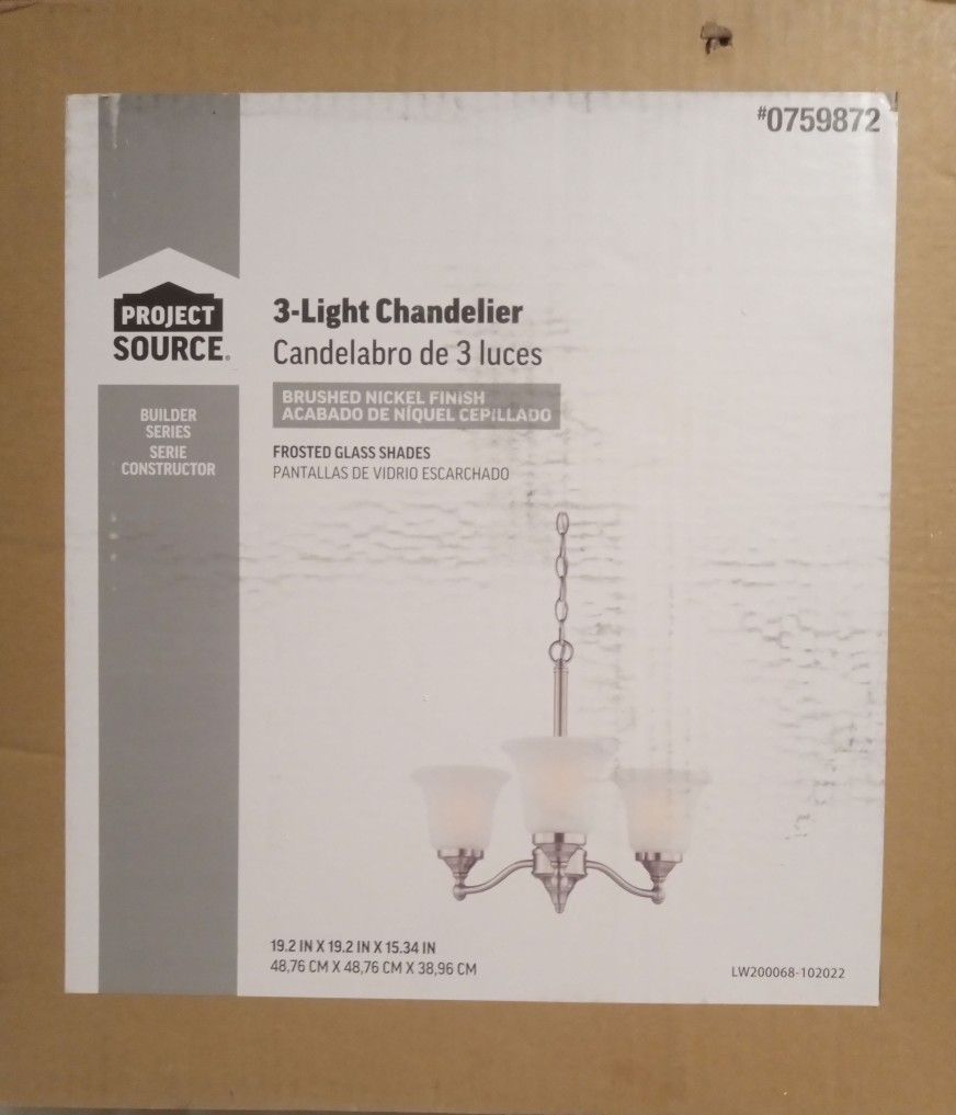 3-light chandelier brushed nickel finish, with a frosted glass shade.