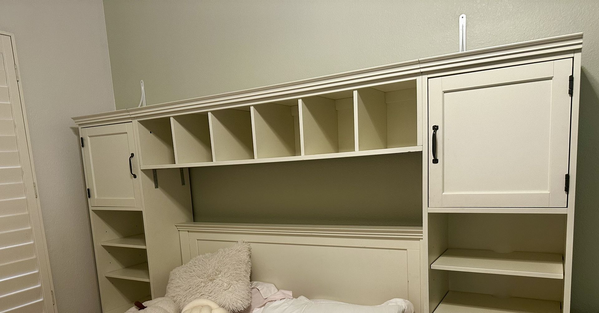 This posting is for two bookcases and one middle connecting piece, as pictured, for three pieces in total. The bed is not included. The furniture is from Pottery Barn, the Hampton bedroom furniture series. One bookcase alone is priced as $999 on Pottery Barn’s website currently. Each bookcase is 73.5 inches tall, 18 inches wide, and 14 inches deep. The middle connector is about 57.5 inches wide.