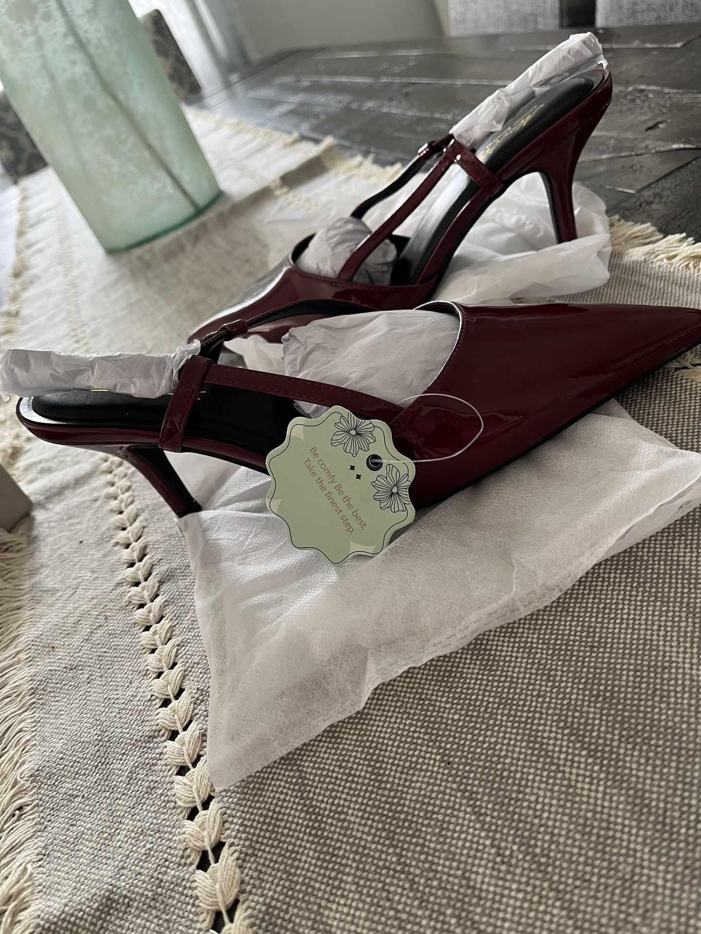 tep out in style with these elegant burgundy slingback heels. Perfect for any occasion, these shoes offer both comfort and sophistication. Color/ Burgandy -- size 8 1/2. Heels are 3" high. With bags.