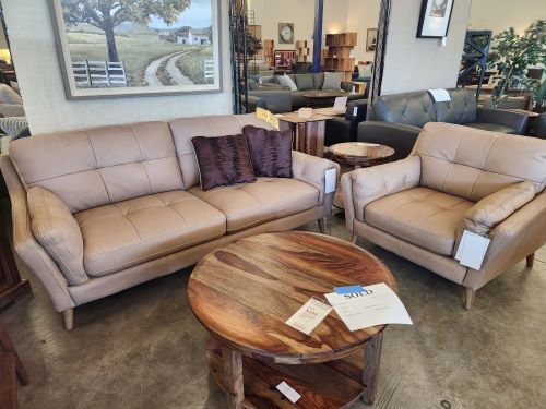 MID CENTURY RUSTIC LOVESEAT/CHAIR SET IN AUTHENTIC TOP GRAIN LEATHER: SADDLE COLOR