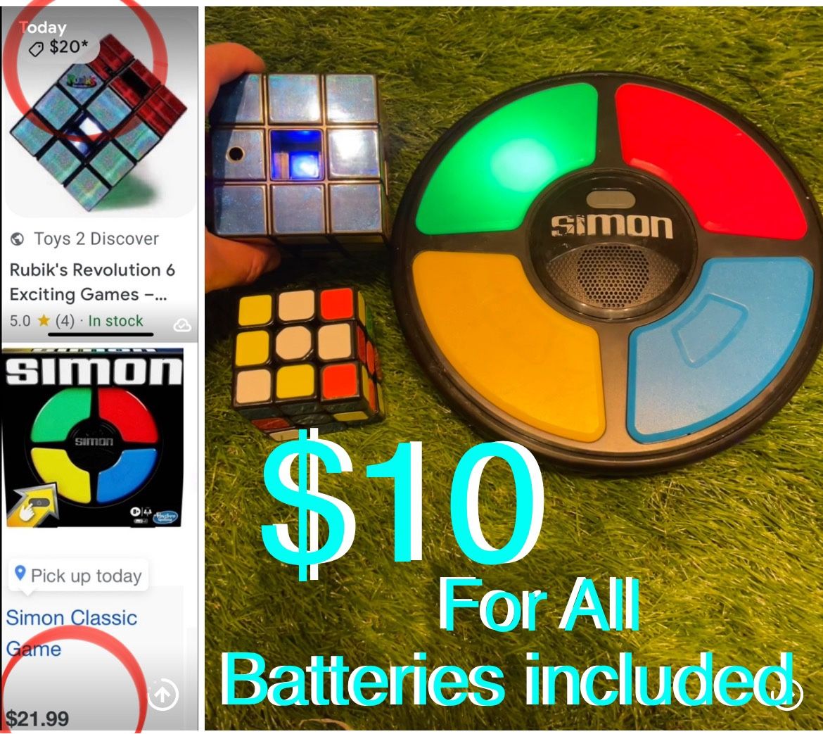 Batteries included all working great,Rubiks revolution 6 talk and light s up,Rubiks timer,Simon classic game all included for $10 cash,pickup in Boca Raton meet in public Dunkin’ Donuts
