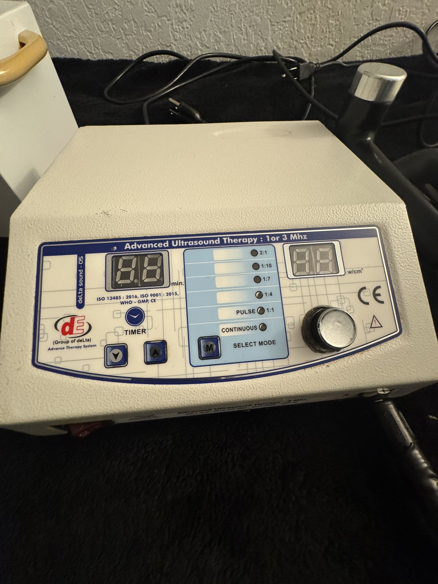 • Dual Frequency: Supports 1 MHz and 3 MHz treatments. • Multiple Modes: Includes Continuous and Pulsed settings (1:1, 1:4, 1:7, 1:10, 2:1). • Adjustable Intensity: Digital display for precise \bm{W/cm^{2}} output. • Built-in Timer: Easy-to-use digital countdown timer. • Compact Design: Durable metal/composite housing. Condition Notes: