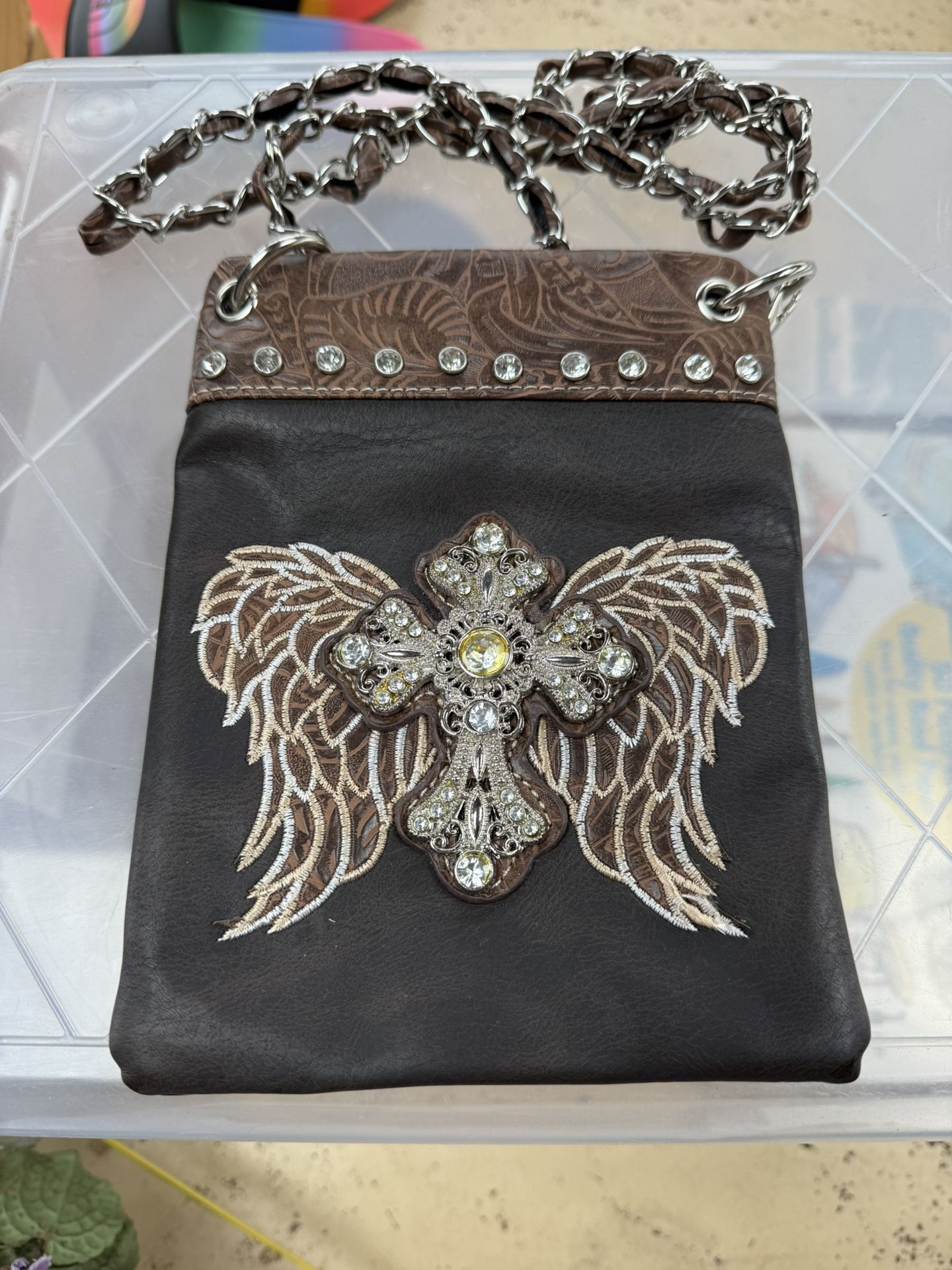 Black crossbody bag with embroidered cross and wing design, chain strap. The "ribbon " will need advancements through the chain see picture, but not a big deal at all beautiful brown with an ivory and tan embroidered 20.00 cash leesburg Cross has all of its embellishment, about 8 by 6 in size cross body